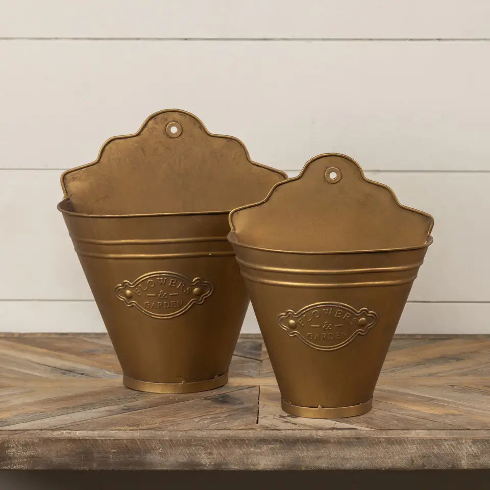 These metal hanging wall buckets, featuring an aged gold finish, are perfect for displaying seasonal greenery or household items with a touch of farmhouse charm.