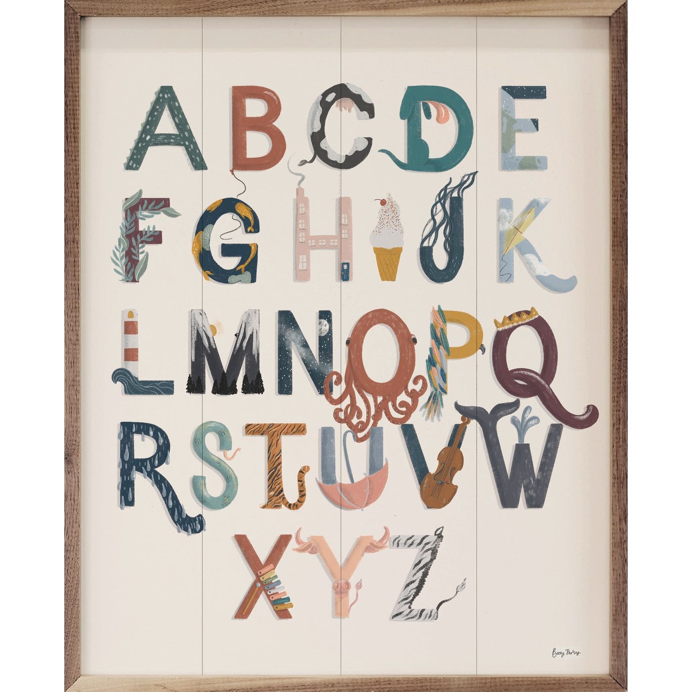 This beautiful wood print, featuring a whimsical watercolor alphabet print on a white shiplap background framed in walnut wood, is sure to provide whimsy and farmhouse charm to any nursery or child's room.