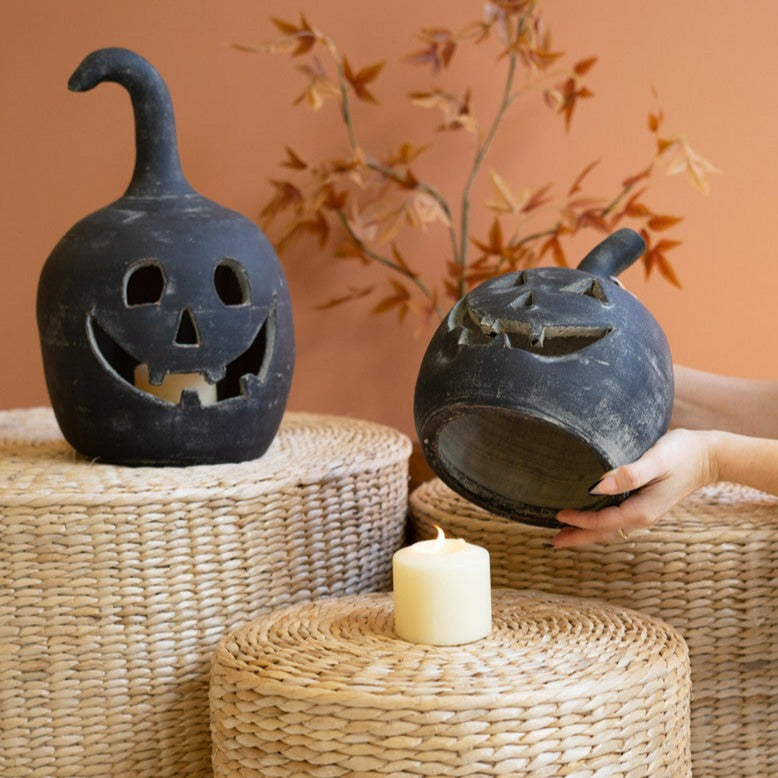 This whimsical Black Clay Jack-O-Lantern Set, featuring two clay pumpkins with a whimsical smile, are perfect for adding a spooky glow with a touch of farmhouse whimsy to any space this Halloween.