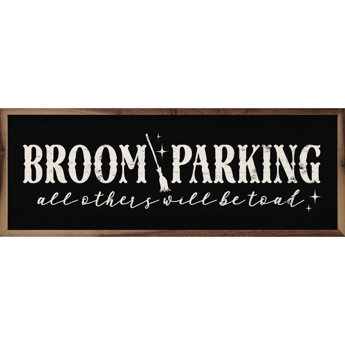 This horizontal wood print, featuring a walnut wood frame with the words "Broom Parking all others will be toad" whimsically written on a white or black background, is perfect for adding a touch of whimsy and farmhouse charm to any space this Halloween.