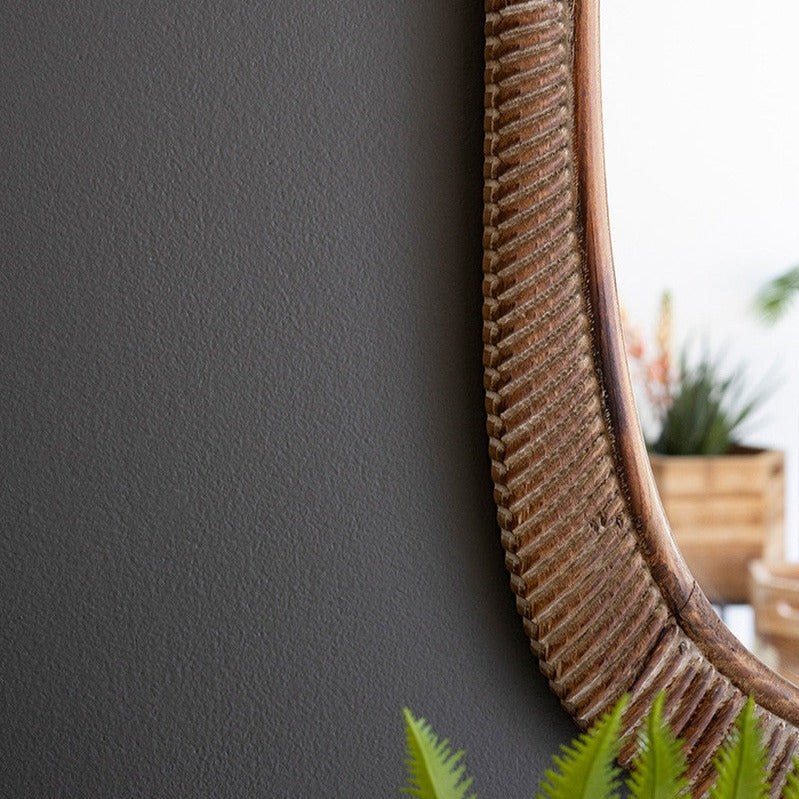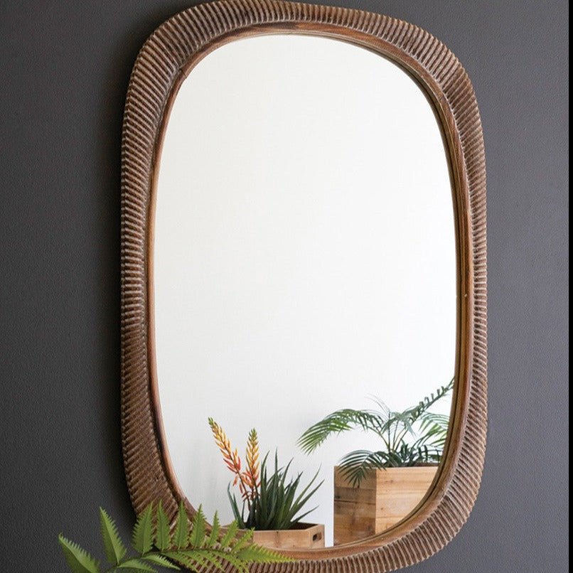 Make a statement with our Carved Wood Framed Mirror, featuring a curvy squoval shape, this mirror is sure to add modern farmhouse sophistication to any space.