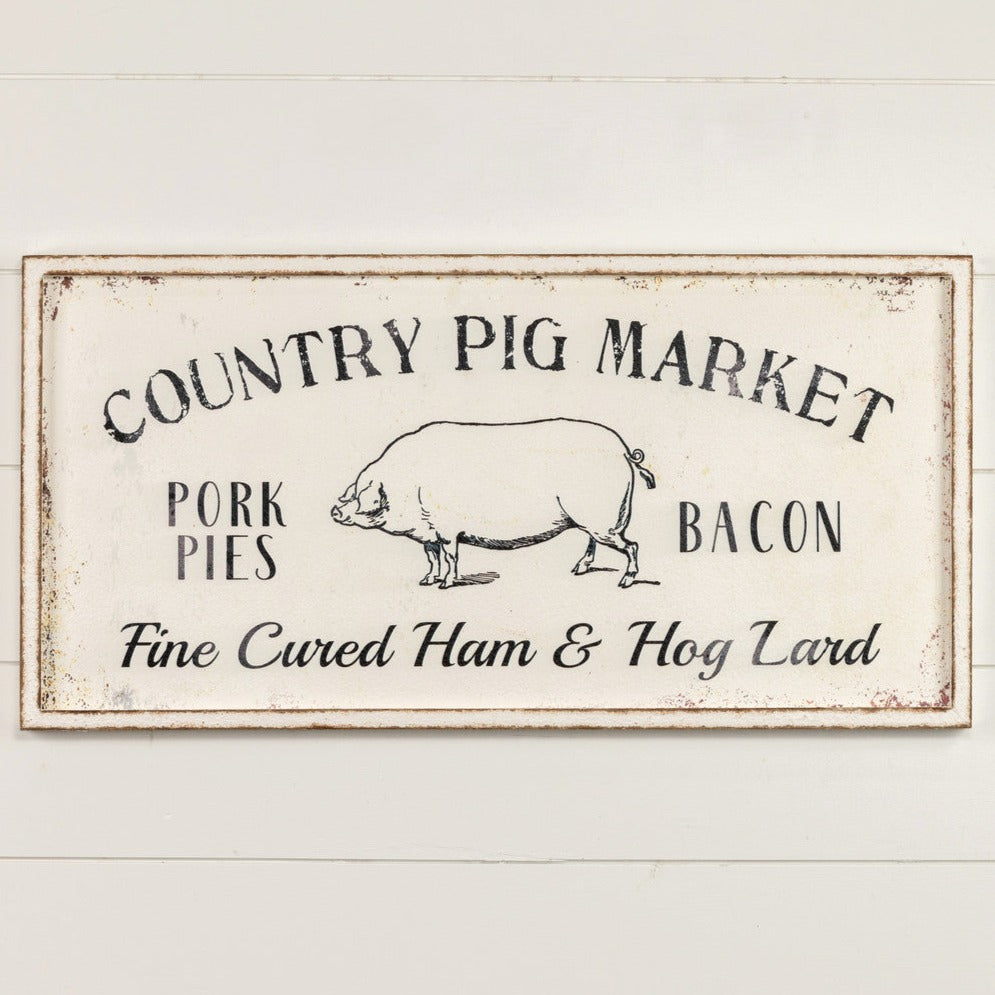 This distressed wood sign, featuring a cream wood background and an advertisement for the Country Pig Market in a faded black whimsical print, is sure to provide whimsy and farmhouse charm to any space.
