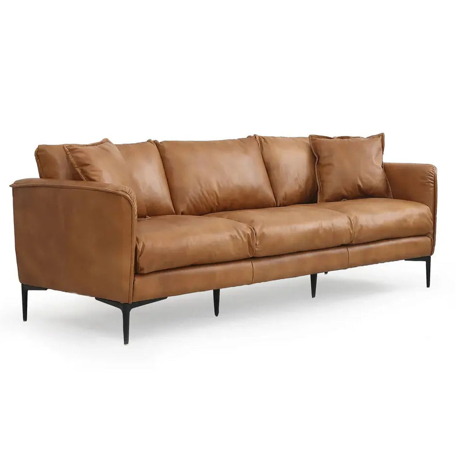 Add elegance and style to your living space with the Cumo Sofa, crafted from top grain brown leather, this sofa exudes luxury and sophistication, the two leather side pillows add a touch of cozy comfort, making it a beautiful choice for any transitional or modern style home.