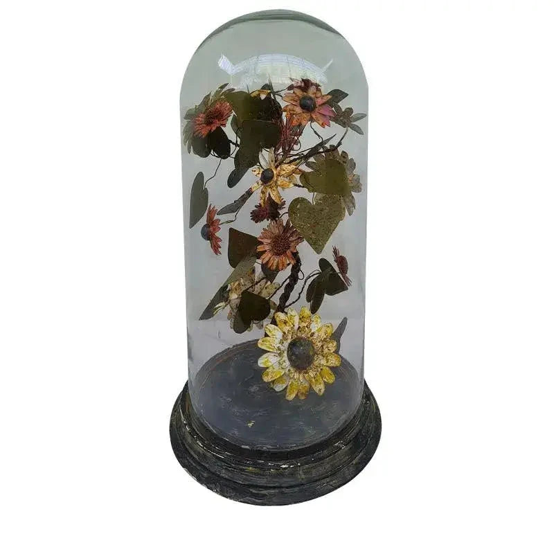 Discover the elegant charm of our French Wire Flowers Under Glass Dome, featuring delicate metal flowers with authentically aged details, this piece will transport you to a bygone era and is the perfect addition to any antique-inspired collection.
