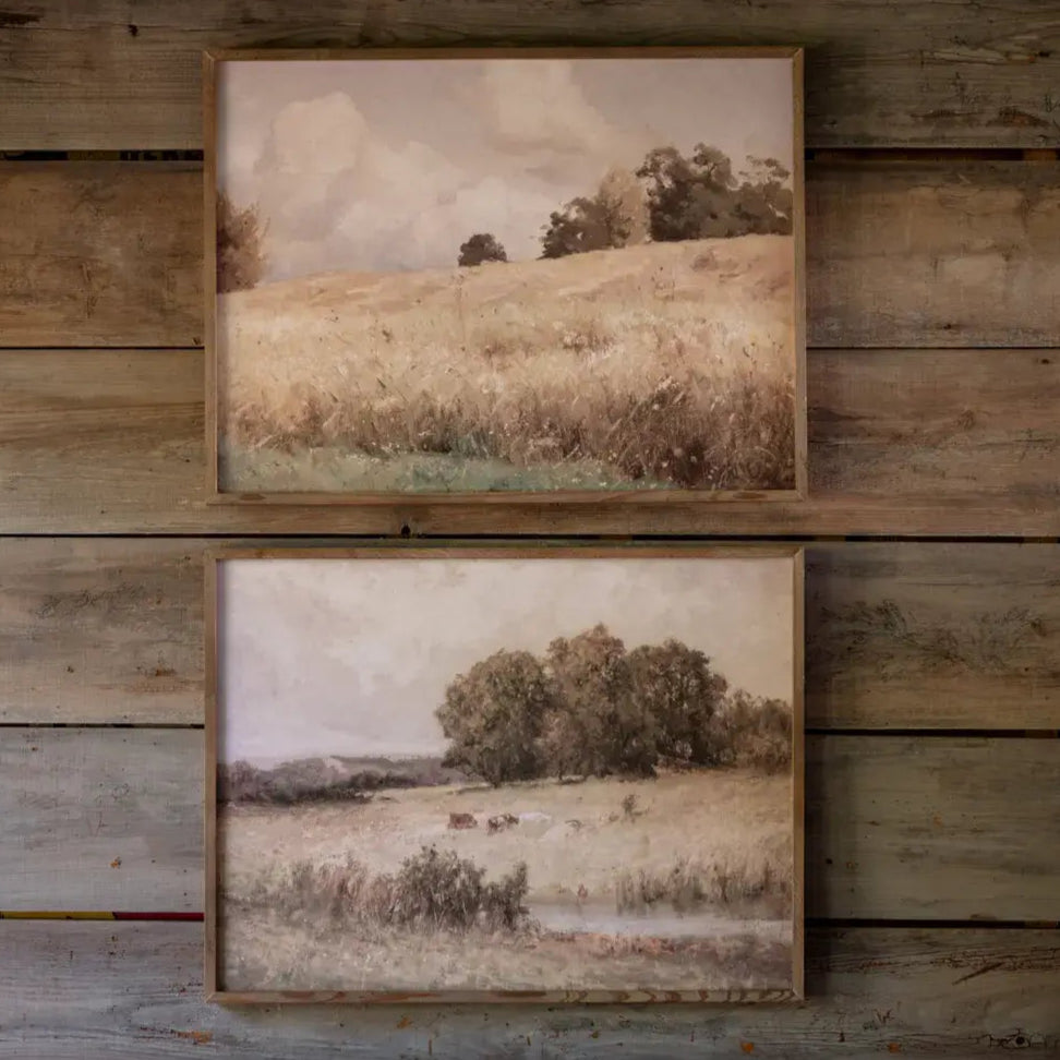 These beautifully serene scenic prints, featuring painted views of an open grass valley, are sure to add interest, beauty, and warmth to any space in your home.