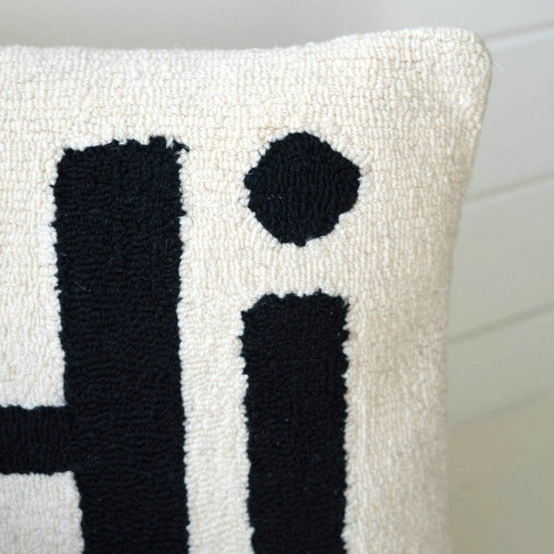 This whimsical hand hooked pillow with the word "Hi" in black on a white background, is beautifully made and perfect for adding a statement piece to an all white bed or sofa.