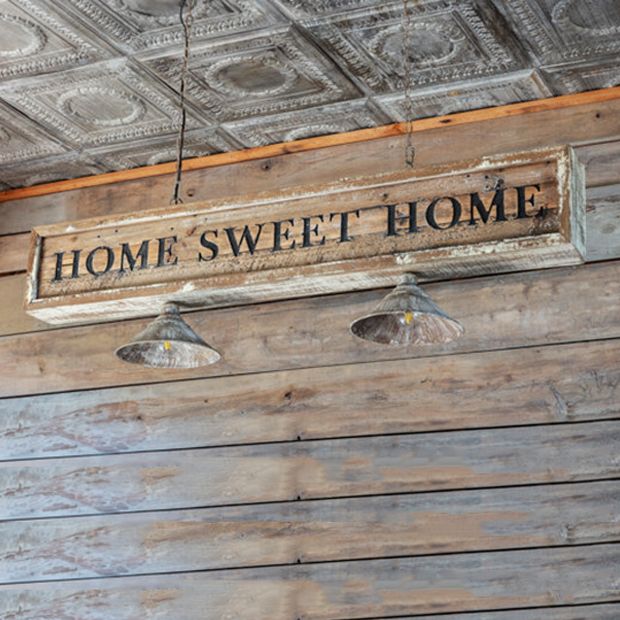 Sure to give your kitchen a true farmhouse feel, this light fixture features a distressed wood finish and the words "Home Sweet Home" with two hanging rusty metal light fixtures below and finished with a metal chain for hanging.