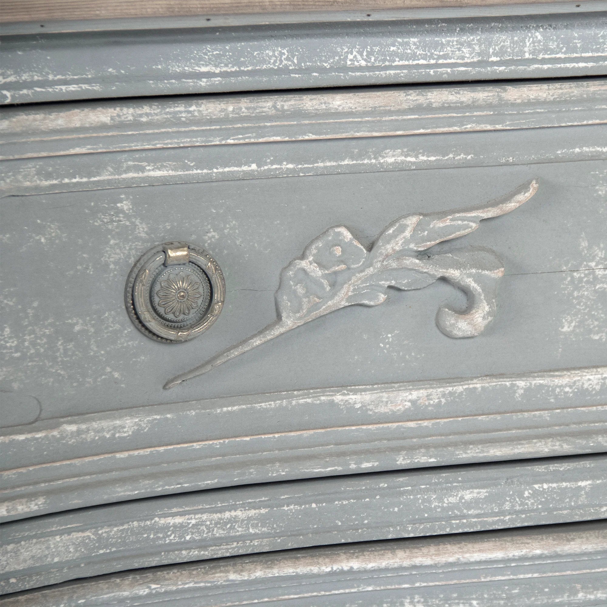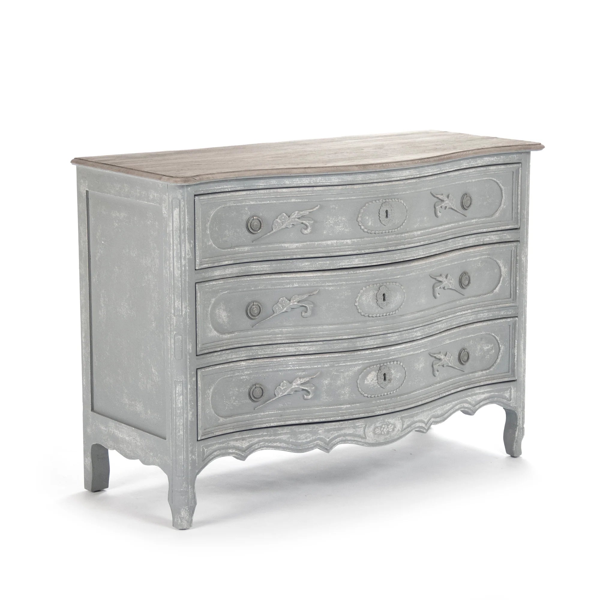 Our Lennon Chest boasts a charming bow front design with elegantly carved details, antique style hardware, and a beautifully distressed painted finish, with three large drawers, it offers ample storage space while adding a touch of vintage elegance to any room.