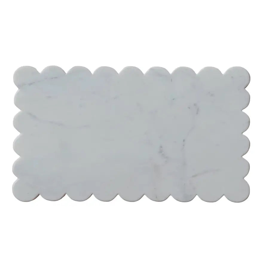 This white marble cheese board, featuring a beautiful scalloped edge, is perfect for serving cheese or other snacks in true cottage farmhouse style.