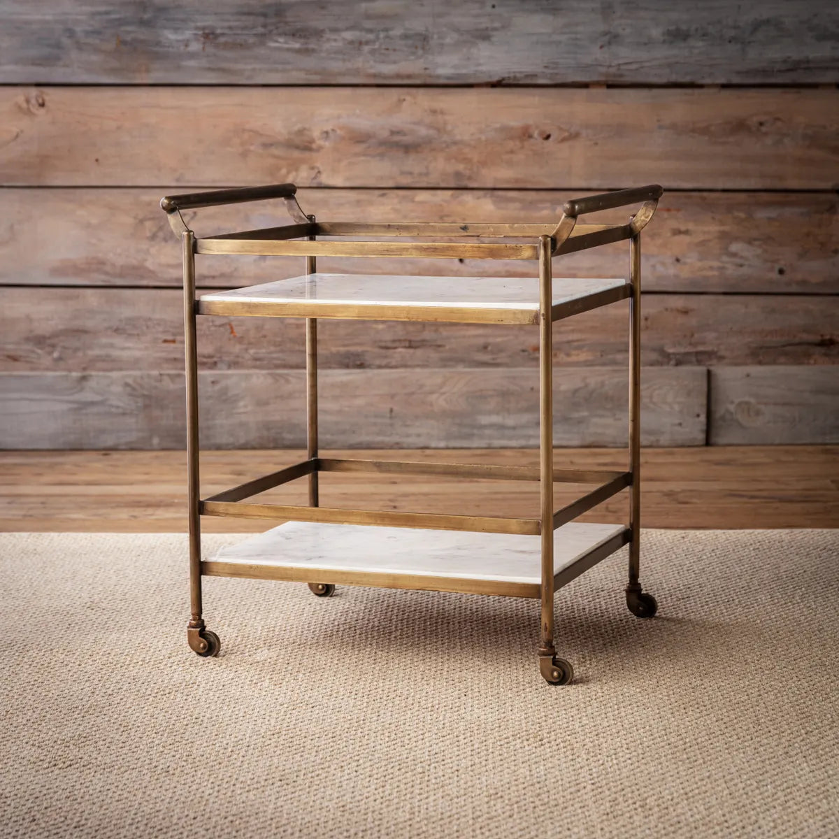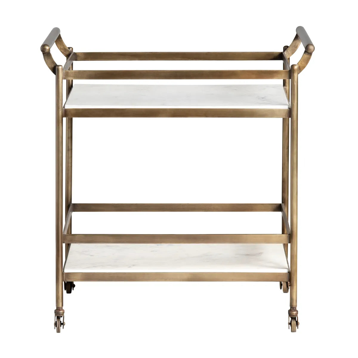 This gorgeous service cart features an elegant combination of antique polished brass and exquisite white marble, making it a perfect addition to any event or home, while its timeless design and beautiful construction provide a sophisticated touch to your hosting and serving needs.