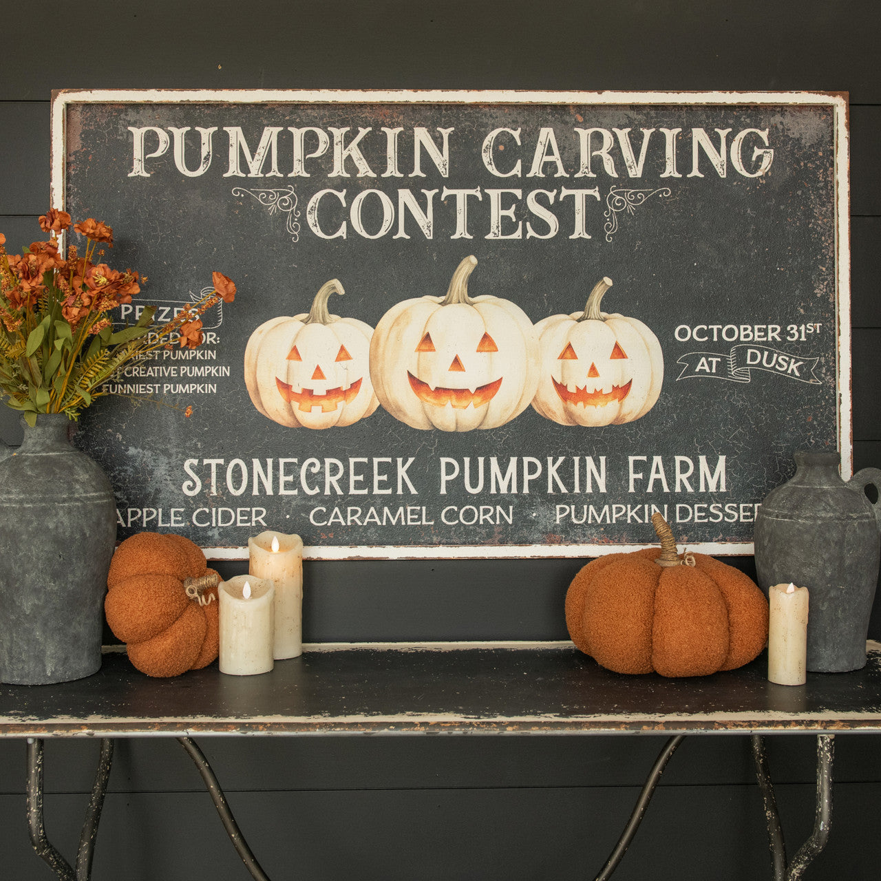 This vintage style metal sign, featuring an advertisement for a Pumpkin Carving Contest whimsically painted on a distressed black background with orange jack-o-lanterns centered in the middle, is perfect for adding a touch of whimsy to your Halloween decor this Fall season.