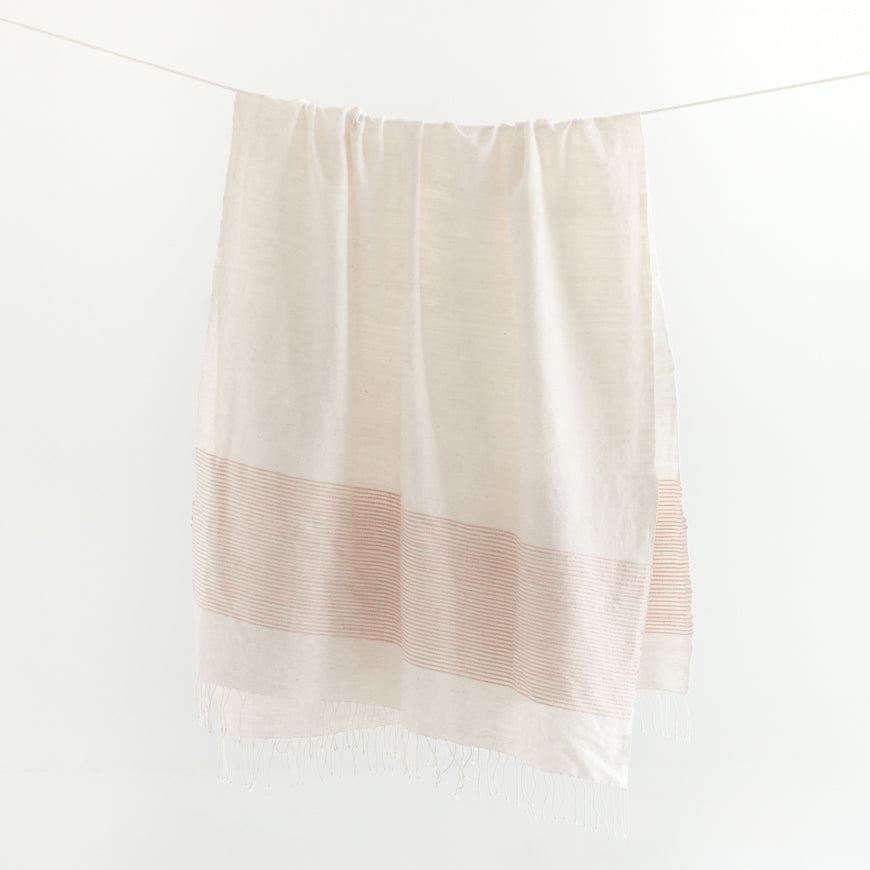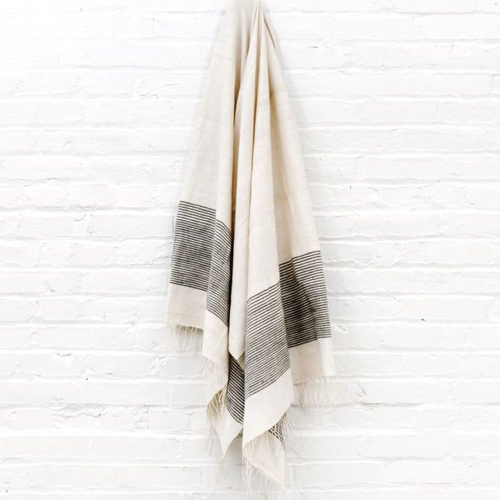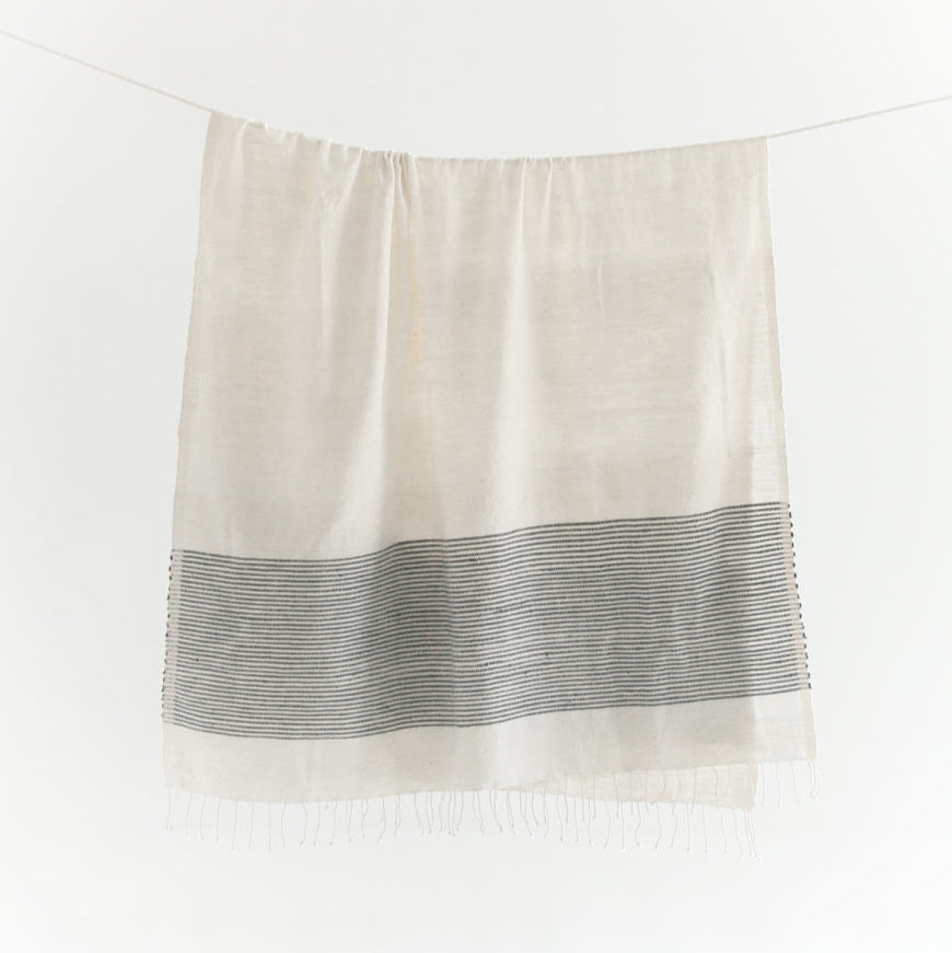 Our beautiful Riviera Bath Towels, hand-woven in Ethiopia using time-honored weaving traditions and AZO-free dyes, feature natural, un-dyed cotton accented with ribbed lines of delicate color, adding beautiful sophistication with uniquely rich texture that will continue to soften and become more absorbent with each wash and dry.