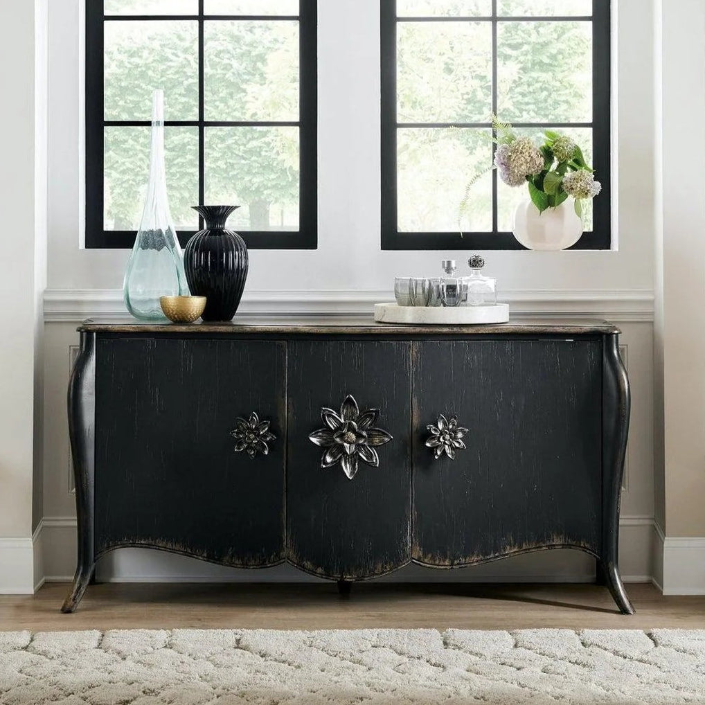 This gorgeous piece, featuring classic bones with a shaped apron and cabriole legs finished with decorative floral hardware, is crafted of poplar and hardwood solids with oak veneers and finished in Porte Noir, a black paint with rich brown undertones with areas of heavy rub through and distressing to reveal a honey tone wood color.