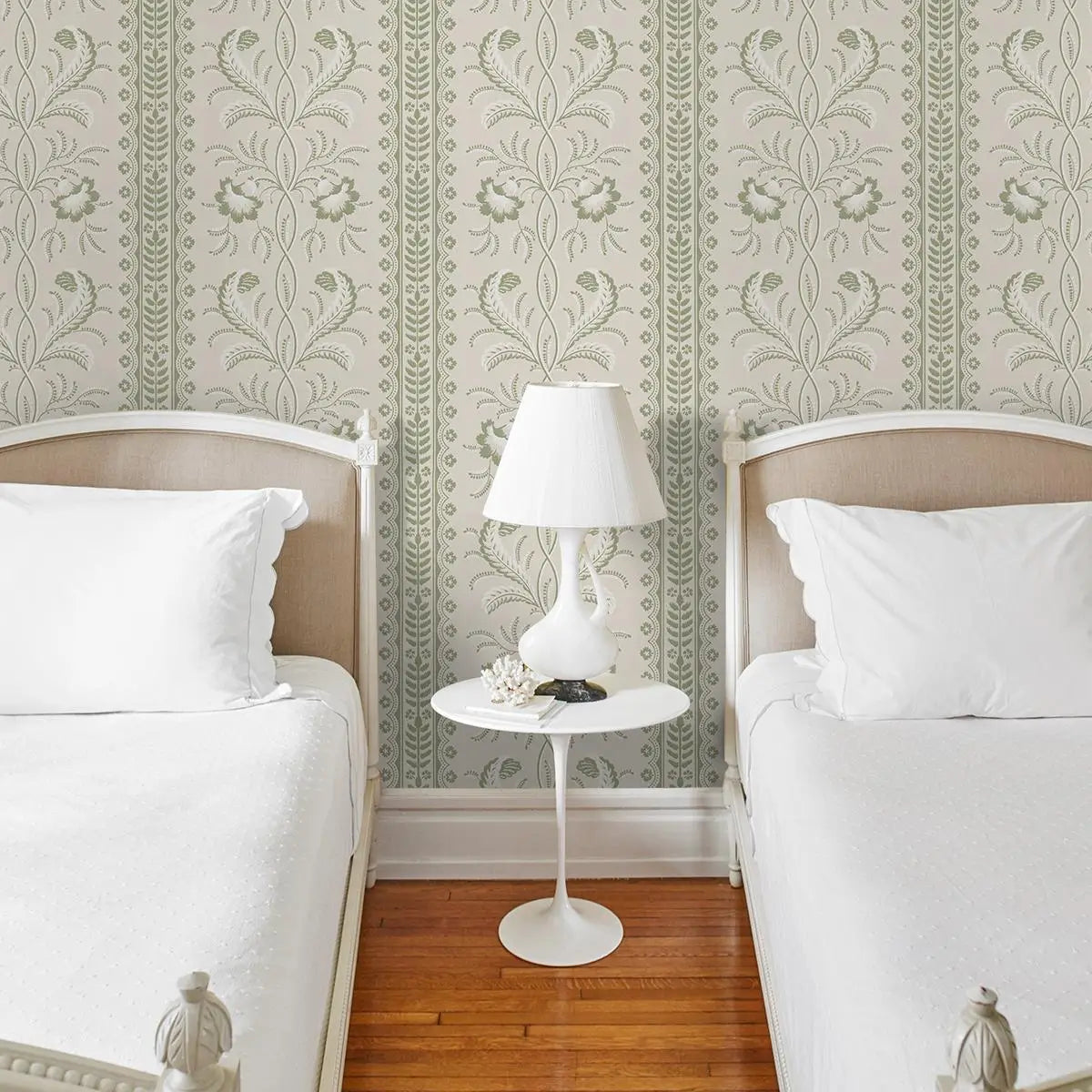 Based on an original design by legendary set decorator Hobe Erwin, Bell Flowers is an ornate and beautifully detailed floral stripe. This elegant medium-scale wallpaper is surface-printed on a flat ground to create lovely texture and dimension.