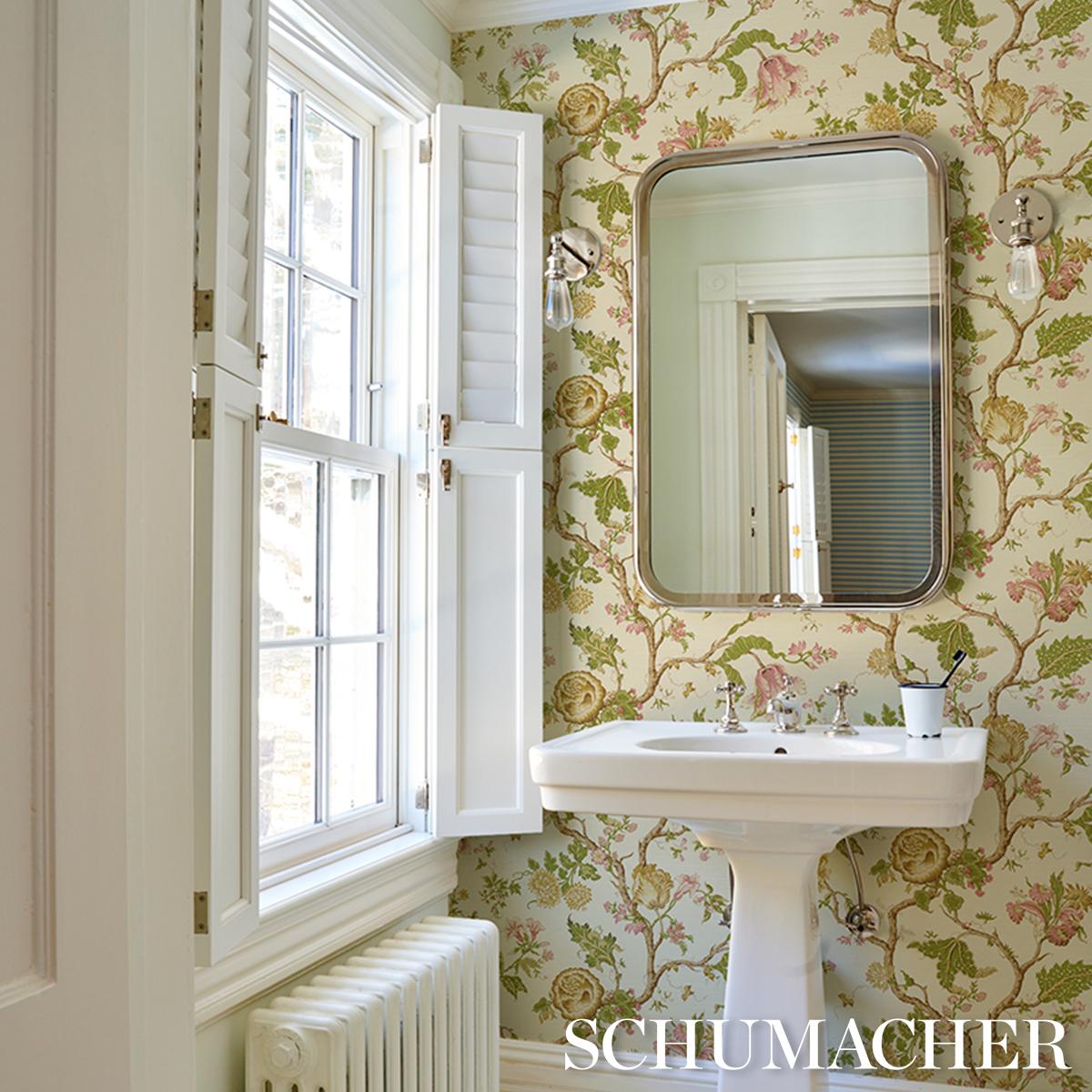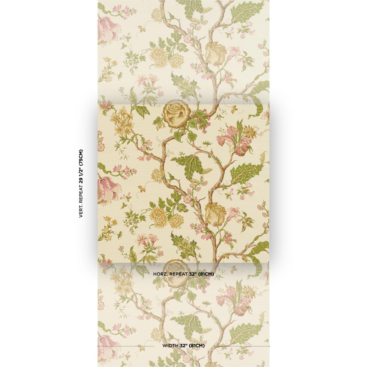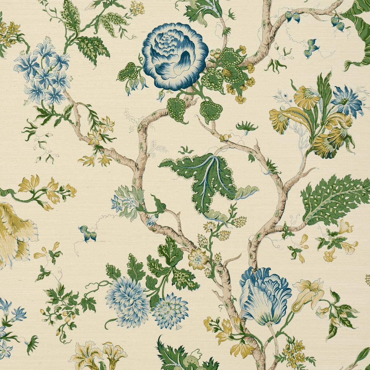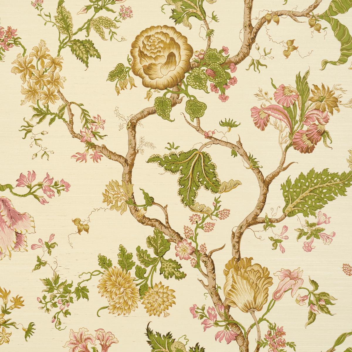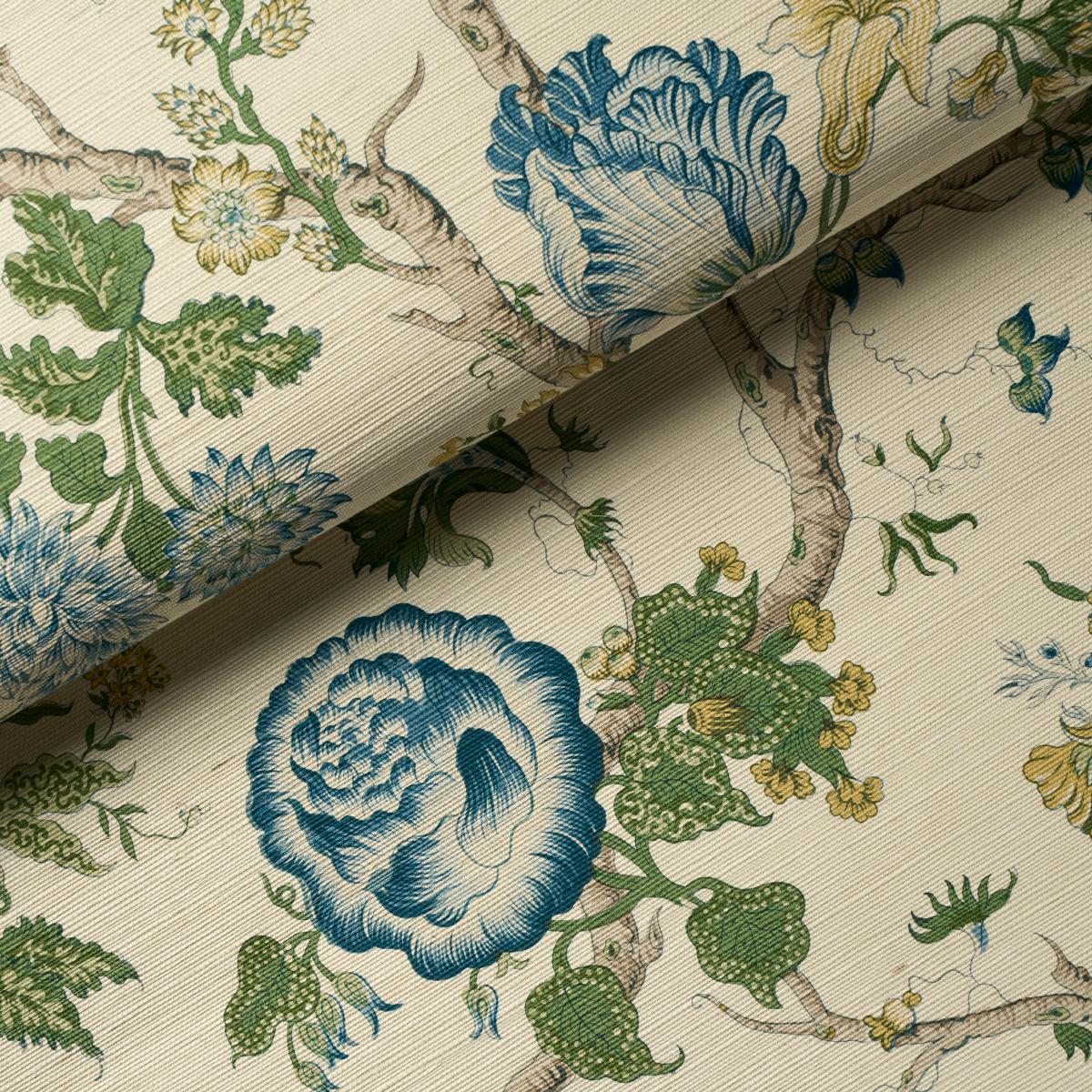 Printed on textured wallpaper, this midscale tree of life pattern authentically reproduces a late 19th-century original. The overlapping areas of color give incredible depth and dimension to the highly stylized flowers.