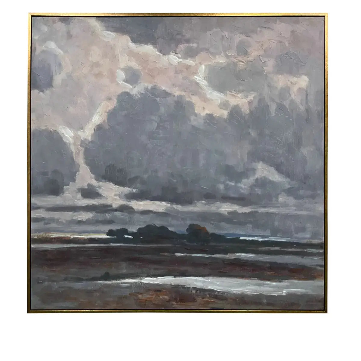 This gorgeous print, featuring a beautifully aged finish of a dramatic marshland under a stormy sky, is sure to add interest, beauty, and warmth to any space in your home. The soft, impressionistic brushstrokes capture the breathtaking movement of billowing storm clouds illuminated by fleeting light, evoking a sense of grandeur and tranquility.