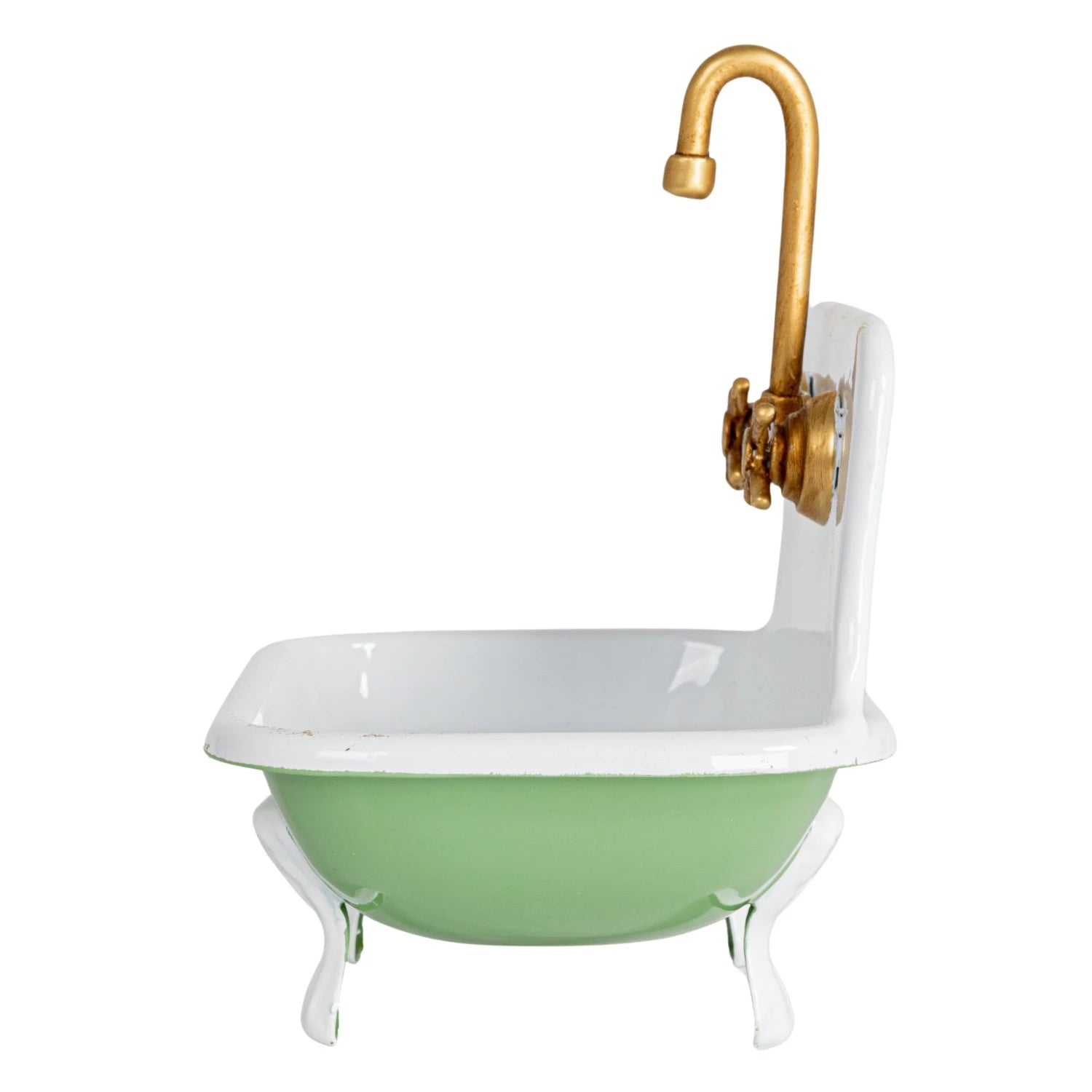 This sweet metal soap dish, shaped as vintage clawfoot sink in a beautiful mint green color, is sure to add a little vintage farmhouse charm to any bathroom or kitchen.