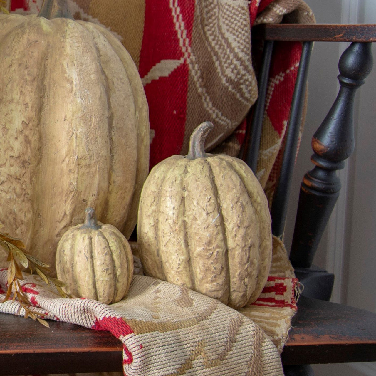These whimsical Mache Pumpkins, featuring a beautiful realistic finish in an antiqued white finish, are perfect for adding beauty and texture with a farmhouse feel to your Fall decor this season.
