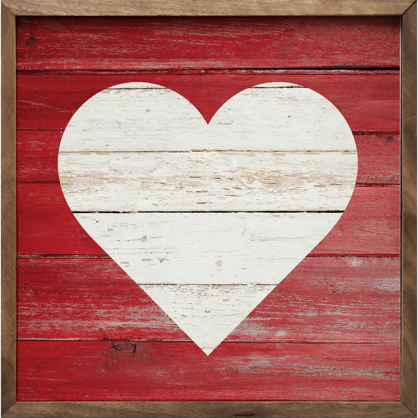 This whimsical wood print, featuring a walnut wood frame and a heart simply printed on a brown, white or red background, is sure to provide beauty and farmhouse charm to any space.