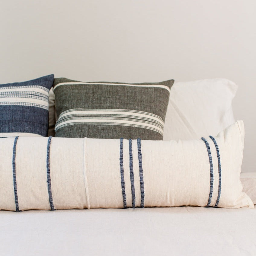 Our Ribbons Lumbar Pillow, generously sized featuring rich woven texture in a classic navy and white combo, is sure to make a statement on any bed or sofa. Each piece is masterfully handwoven in Ethiopia from the finest hand-spun cotton that is easy to care for and will continue to soften with use.