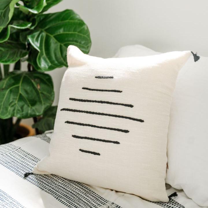 This beautifully unique pillow draws inspiration from Tunisia’s rich Berber heritage, featuring hand-woven cotton embroidered with black wool and finished with petite tassels, each pillow is watchfully spun, woven and embroidered by a small mother-daughter led group of women in Tunisia’s capital city, Tunis.
