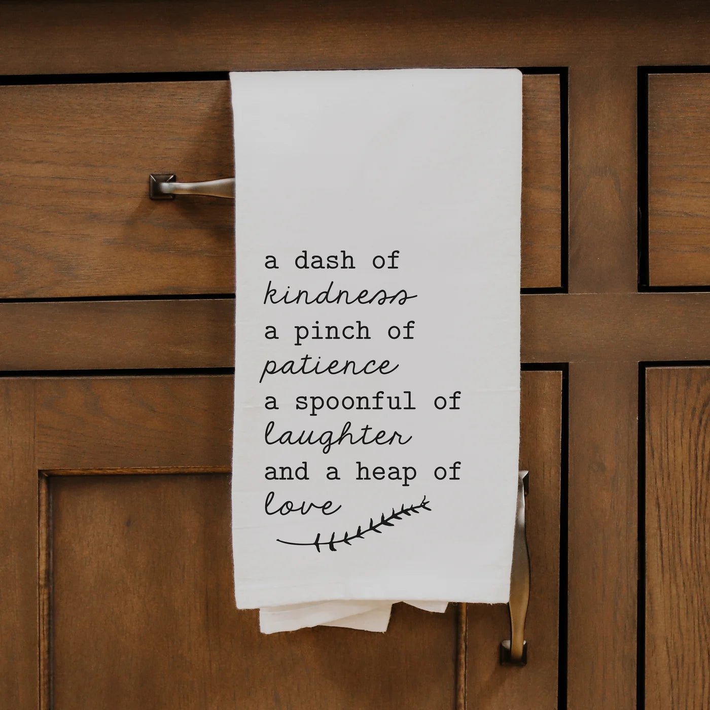 With its whimsical message, our black and white dishtowel, featuring the words "A dash of kindness, a pinch of patience, a spoonful of laughter, and a heap of love" makes a whimsical gift for yourself or someone special.
