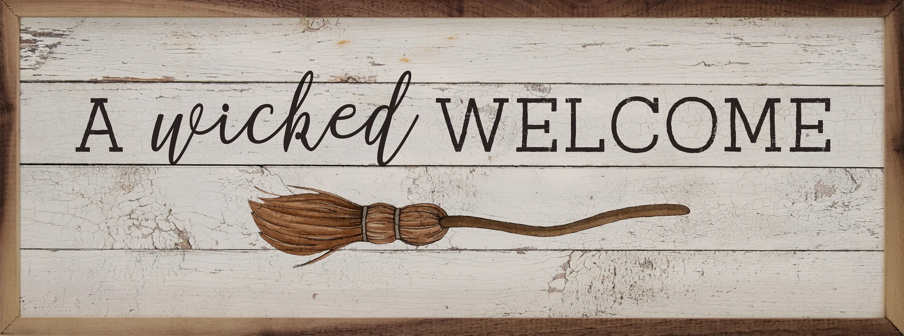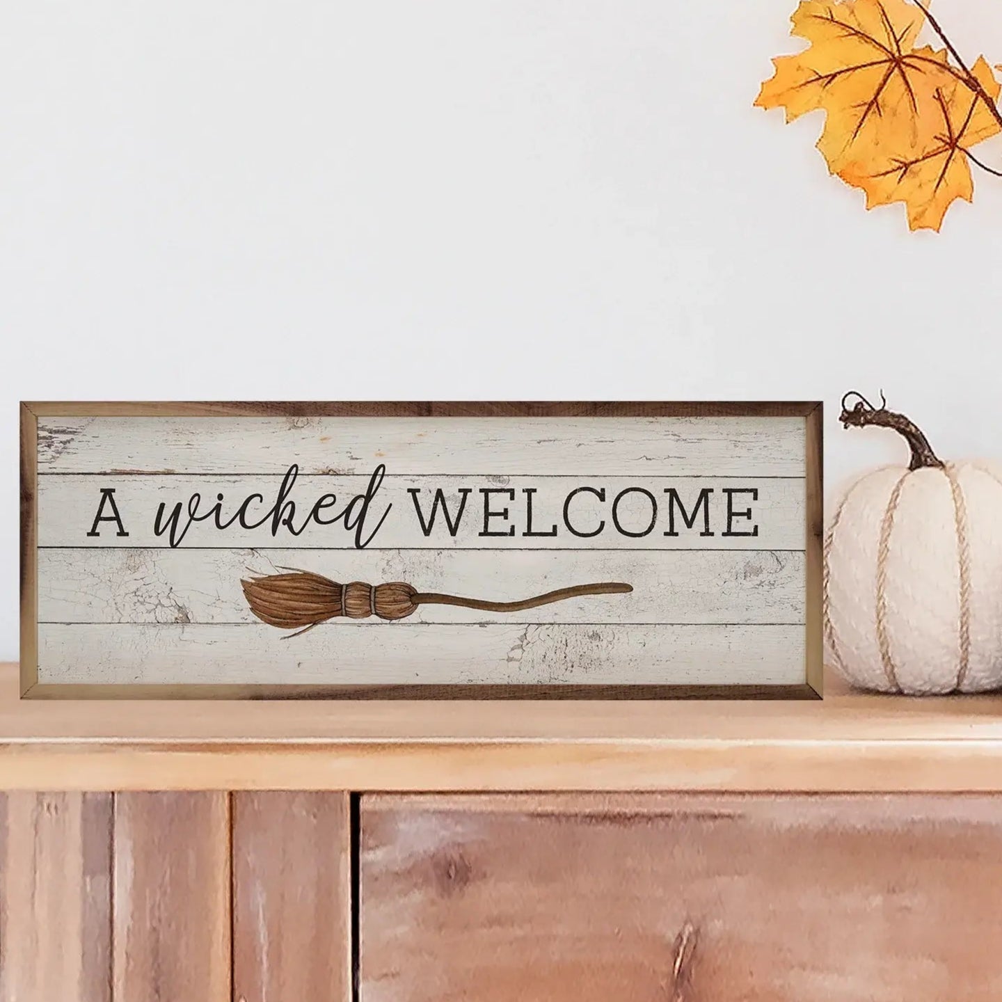 This charming Halloween sign features a shiplap background framed in warm walnut wood, featuring playful script and a rustic broom detail, give it just the right touch of cottage whimsy for a festive fall display.