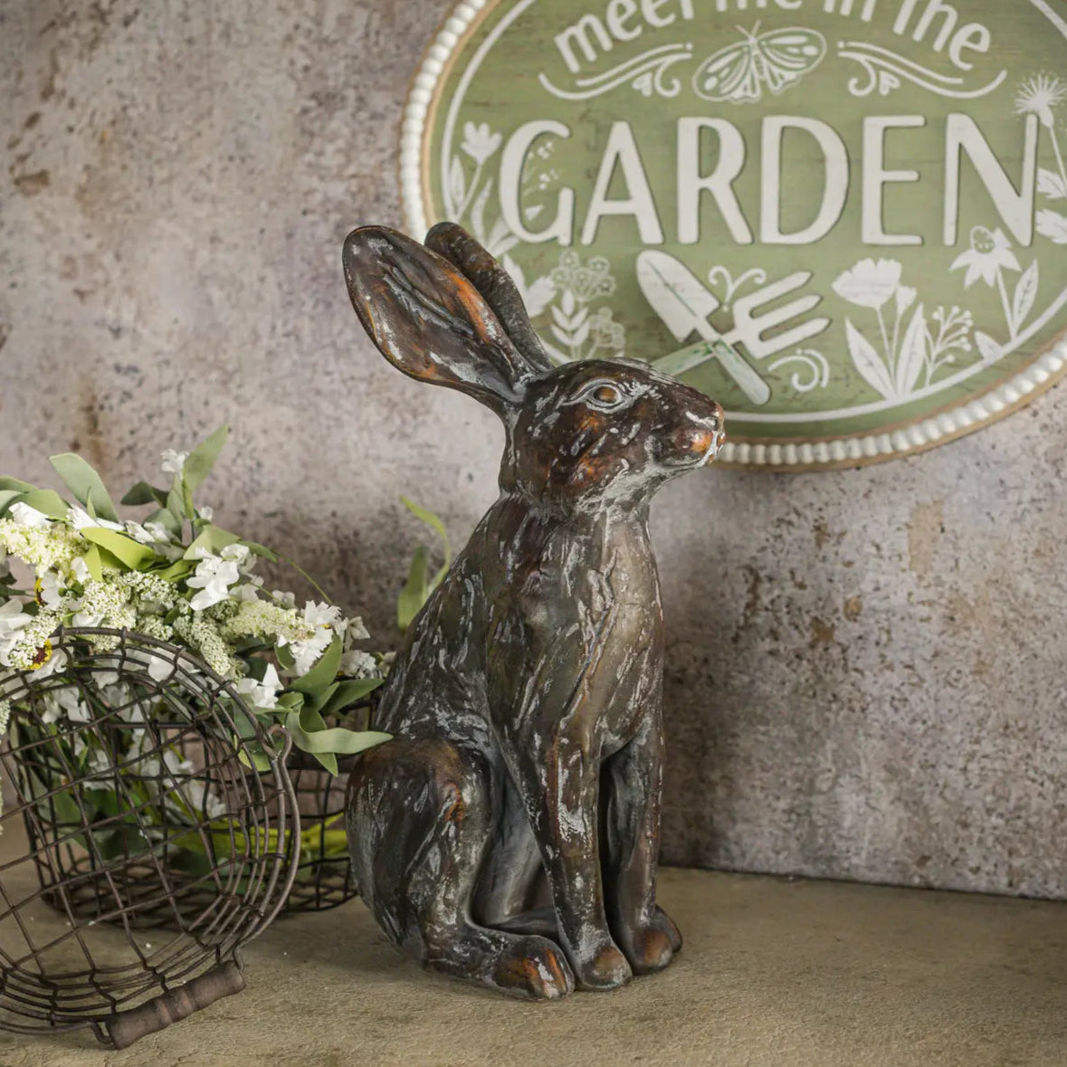 This sweet resin rabbit, featuring a distressed finish, is sure to add a little farmhouse whimsy to any space whether displayed in the garden amongst flowers or indoors for a Spring tabletop.