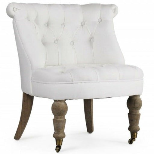 The Amelie White Slipper Chair is sure to add an elegant farmhouse feel to any space, featuring a limed grey oak frame, white linen upholstery, and front casters, this chair is both beautiful and functional.