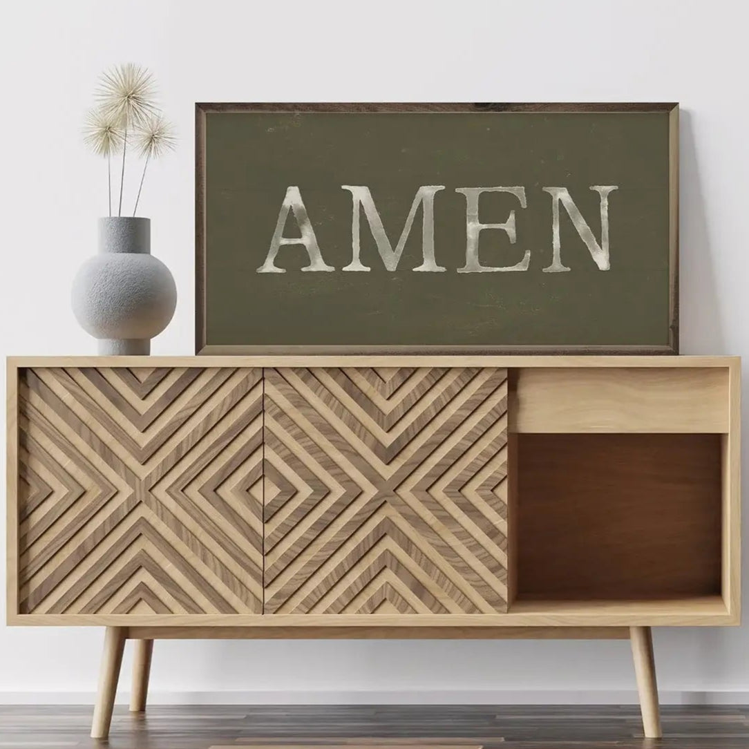 This vintage style wood print, framed in walnut wood featuring the word "Amen" simply printed on a shiplap background of various colors, is sure to provide beauty and farmhouse charm to any space.