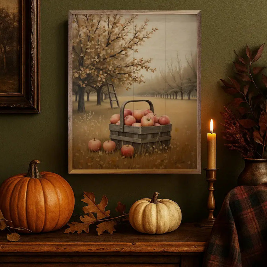 This charming print captures the warmth of an autumn orchard, with a basket of freshly picked apples under golden trees and set against a shiplap style background, framed in walnut wood, it brings a nostalgic, cozy feel, like a memory of crisp fall mornings and apple-picking adventures.