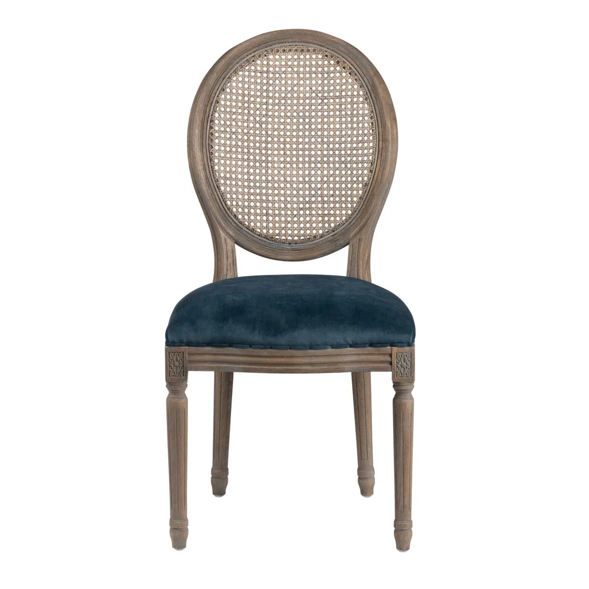 Add touch of rustic farmhouse elegance to your dining room with these cane back wood chairs featuring a classic bistro style oval caned back with an aged wood finish and a gorgeous blue upholstered seat.