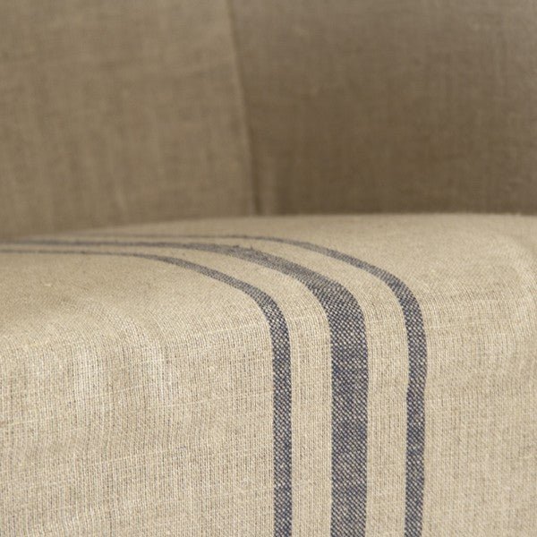 The Avignon Blue Stripe Slipcover Bar Stool, featuring a limed grey oak frame with farmhouse style central blue stripes on a neutral linen slipcover, is perfect for adding casual elegance to any kitchen or dining room.