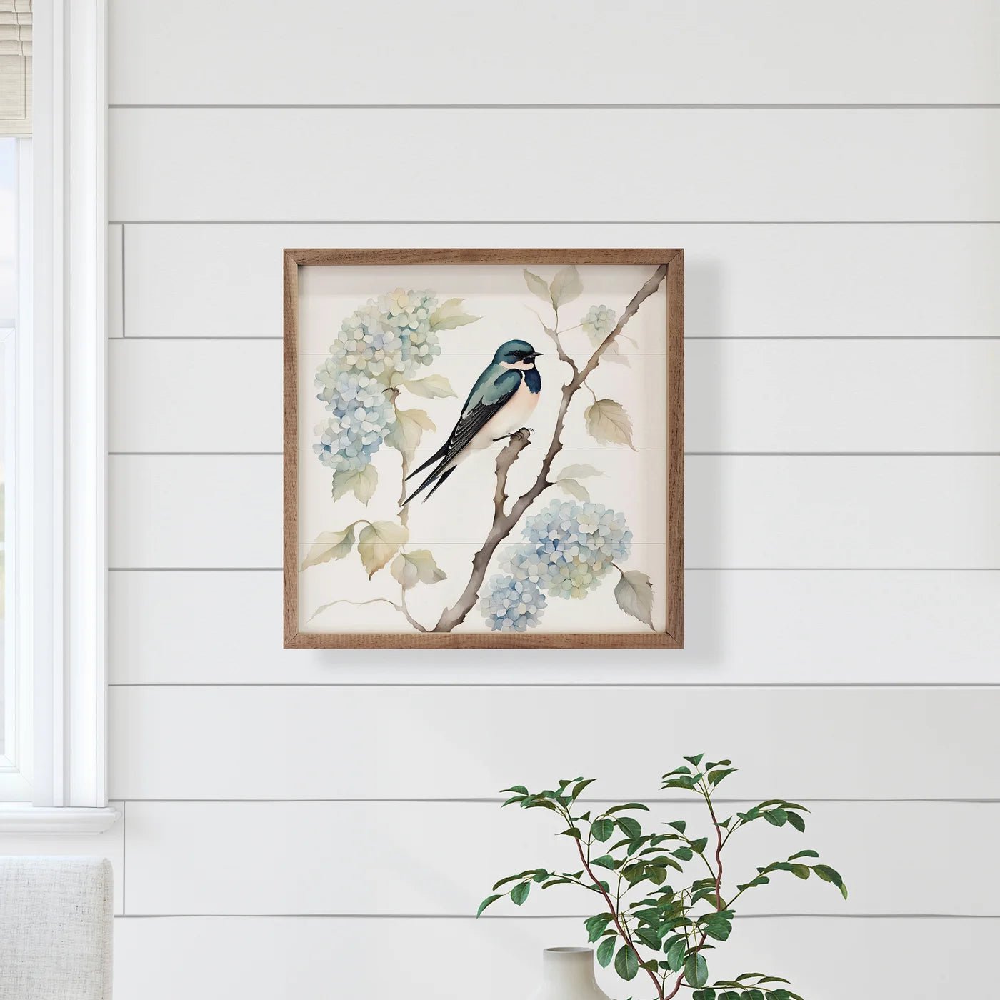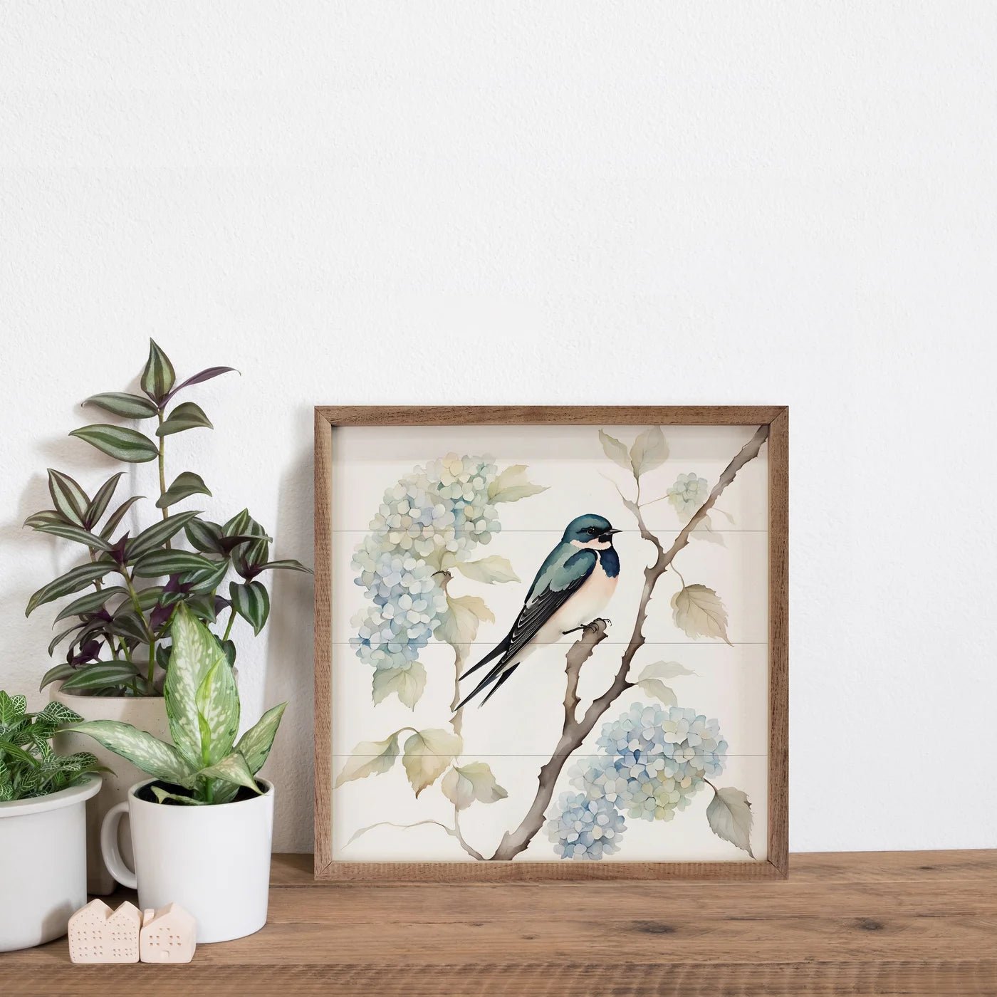 This vintage style wood print, featuring a walnut wood frame and a beautiful watercolor hydrangeas and barn swallow print, is sure to provide beauty and farmhouse charm to any space.