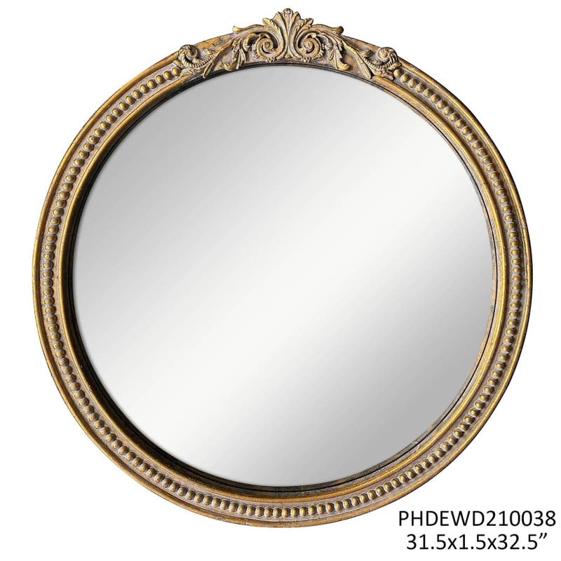The Barrie Gold Round Mirror boasts a graceful round shape and an elegant aged gold patina finish, enhance any space with a touch of sophistication and charm.