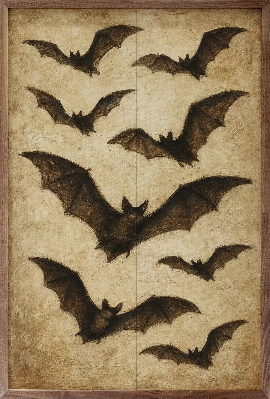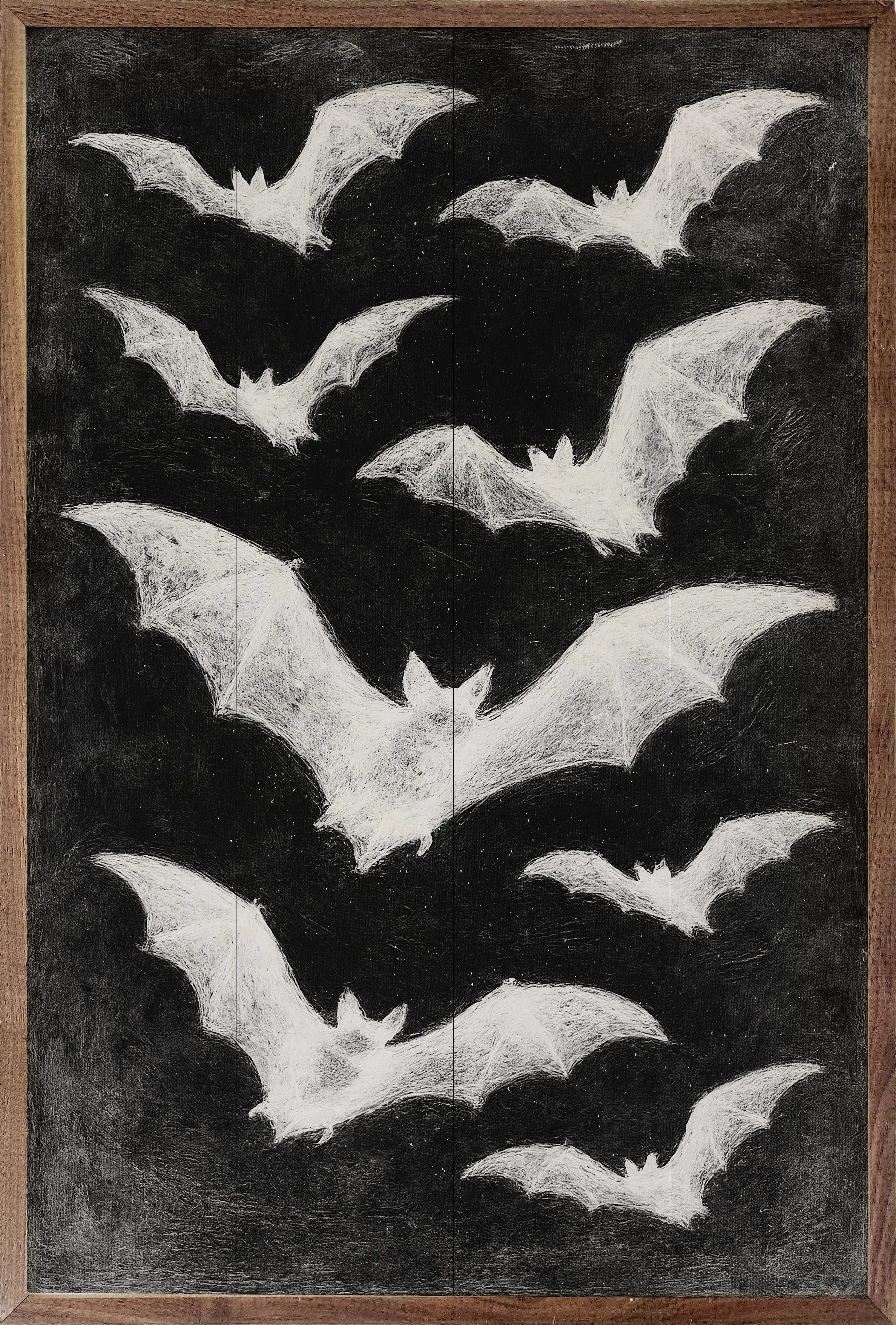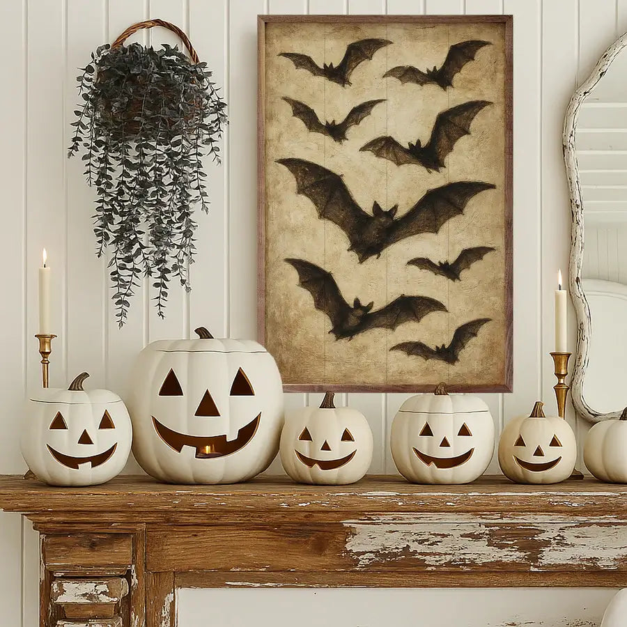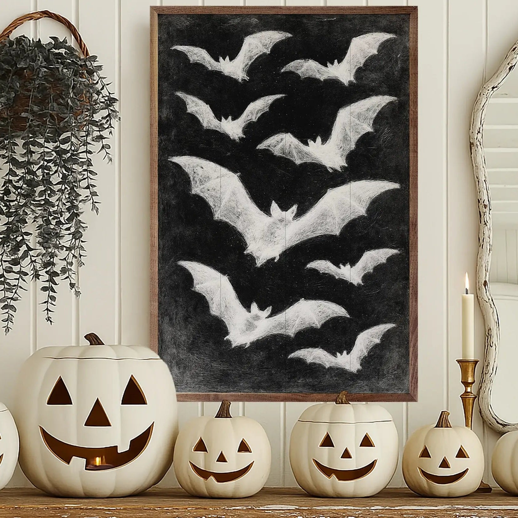 This bold Halloween bat print, set against a shiplap background with a walnut wood frame, adds the perfect touch of spooky charm to your seasonal decor.