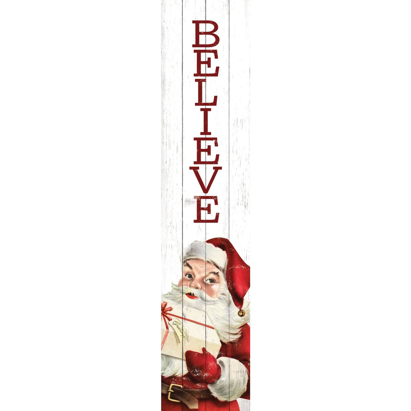 This vertical wood print, featuring the word "Believe" simply printed in red above a  vintage Santa on a whitewash background, is sure to provide whimsy and farmhouse charm to your home's front porch or entryway this holiday season.