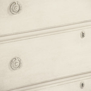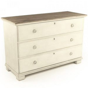 This beautifully simple chest of drawers features a weathered cream and natural finish with three drawers and beautiful French style hardware, a perfect storage piece for adding farmhouse charm to any space.