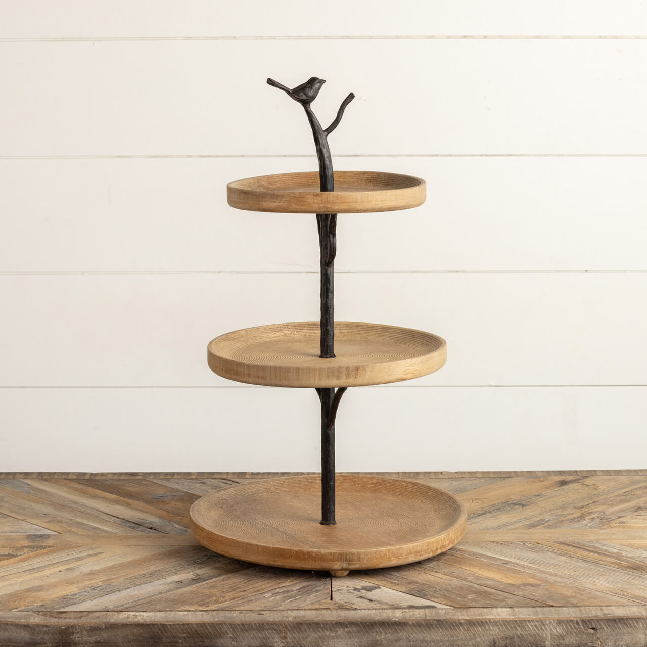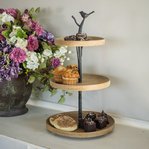 Our Bird On A Branch Three Tiered Wooden Tray, featuring a metal center rod resembling a branch with a sweet bird perched on top, would look beautiful in any room.