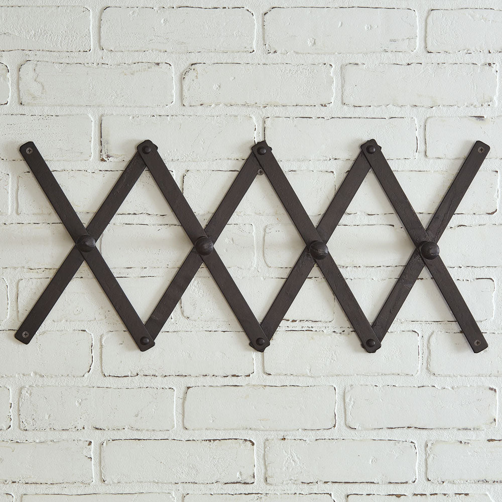 This black wall accordion hook rack, featuring 4 peg hooks, is a perfect complement to any vintage farmhouse mudroom or laundry room.