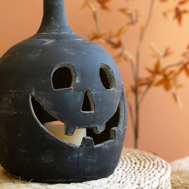 This whimsical Black Clay Jack-O-Lantern Set, featuring two clay pumpkins with a whimsical smile, are perfect for adding a spooky glow with a touch of farmhouse whimsy to any space this Halloween.