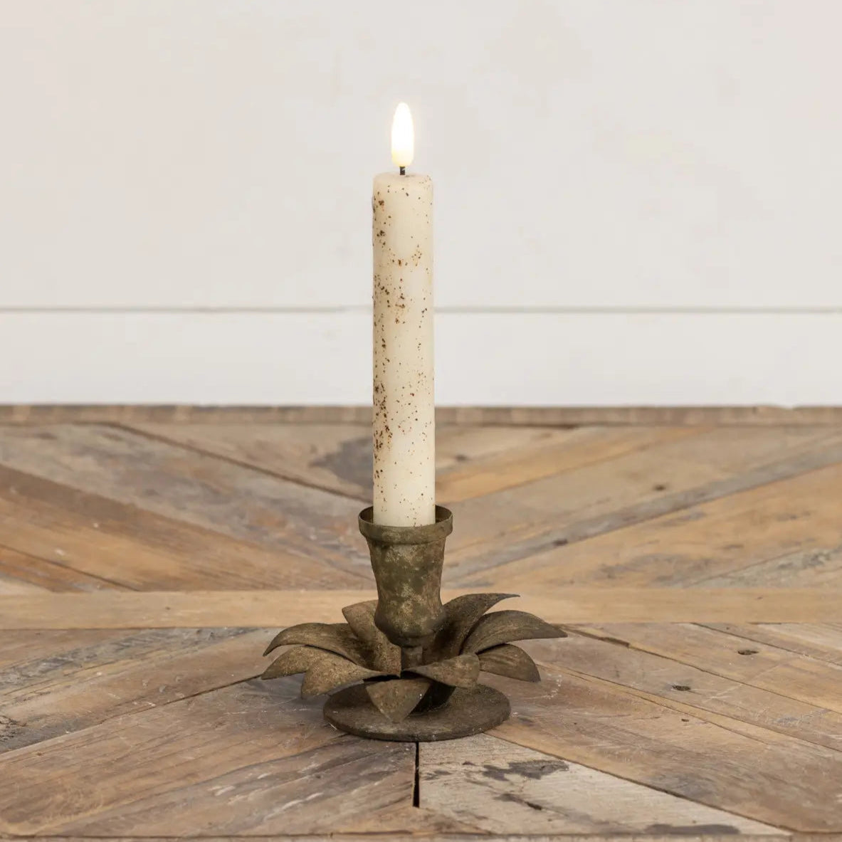 These metal taper candle holders are full of vintage charm, featuring a distressed metal finish in a textured petal design, they are perfect for adding a farmhouse feel to your living or dining room.