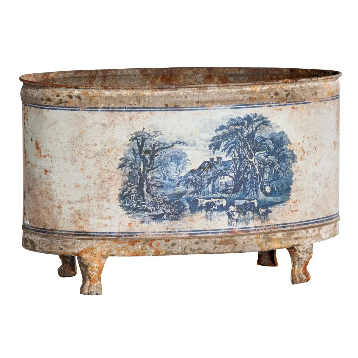 Our Blue Pastoral Oblong Tole Container has a beautifully aged finish, featuring a classic blue and white French Farm scene, this container is a beautiful choice for seasonal and everyday greenery and is sure to add beauty and charm to any space.