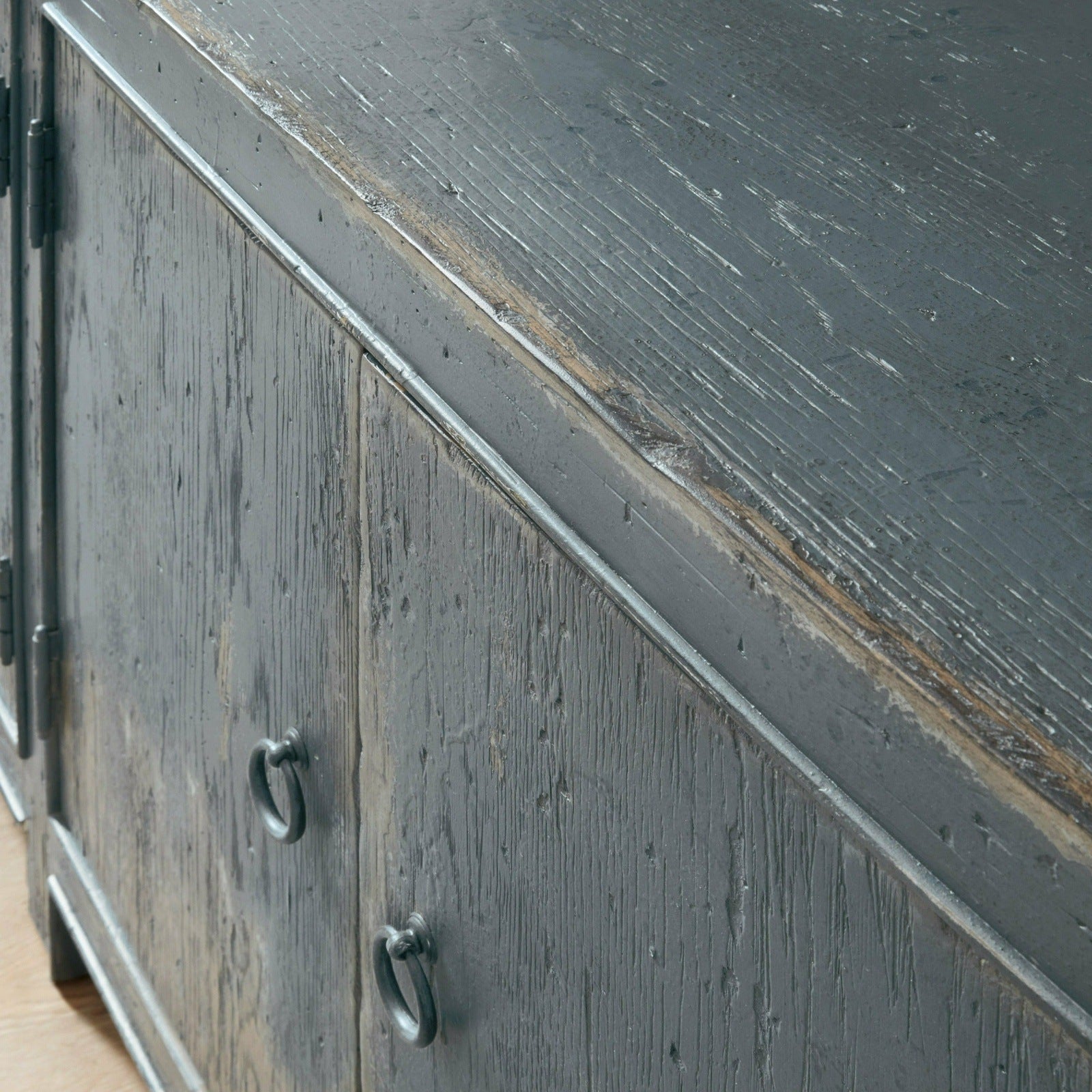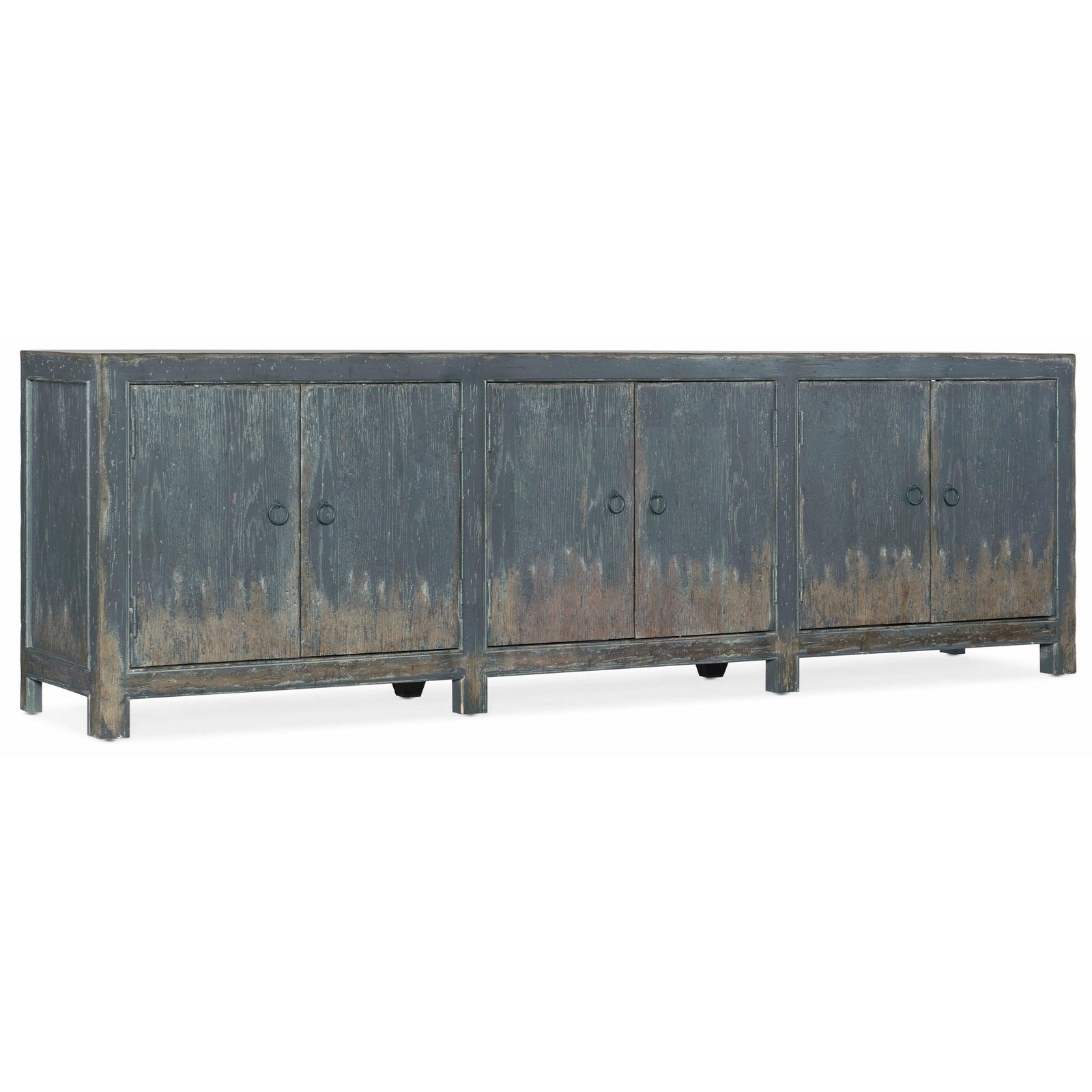 The Boheme Salvatore Media Console exudes simplicity and authenticity with its heavily distressed antique blue finish and dry brushing effect with matching blue painted hardware, featuring six doors with one adjustable shelf behind each pair of doors, this cabinet is sure to make a statement in any farmhouse while offering an abundance of storage.