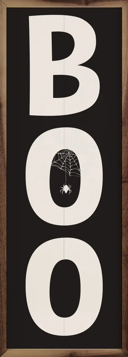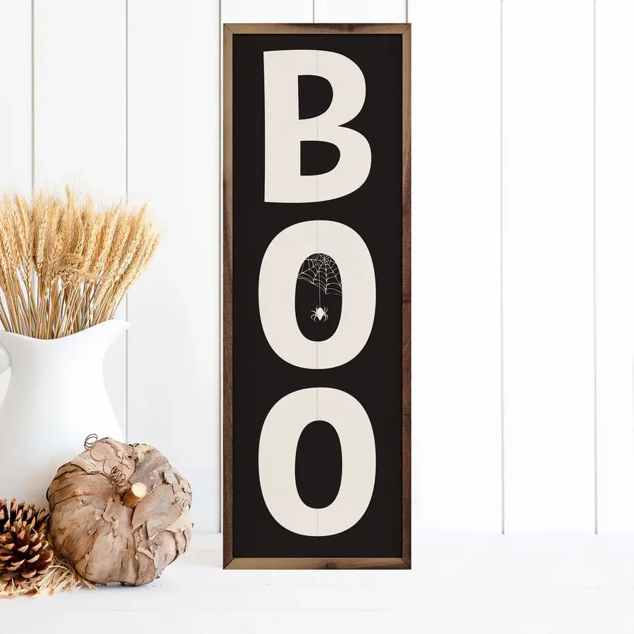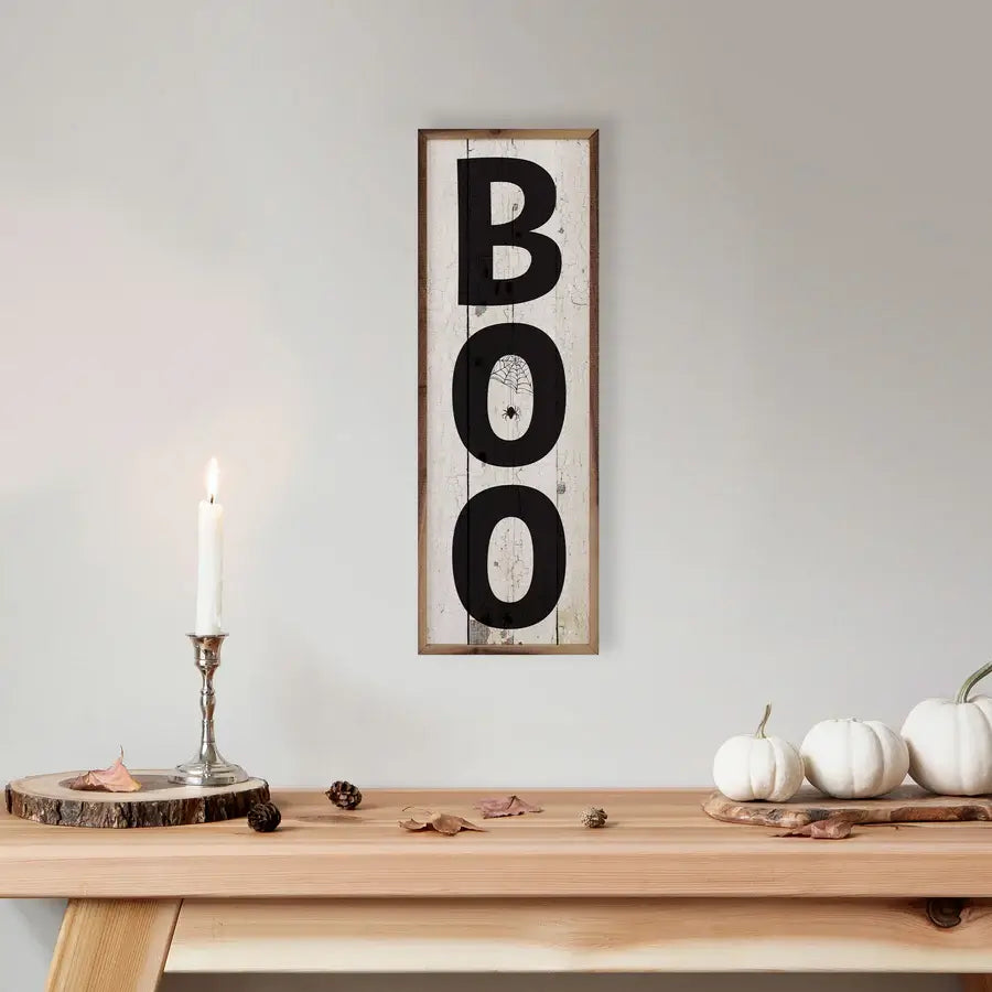 Bold and playful, this vertical “BOO” sign brings festive Halloween charm with its distressed shiplap background and walnut wood frame, perfect for entryways, mantels, or spooky little corners.