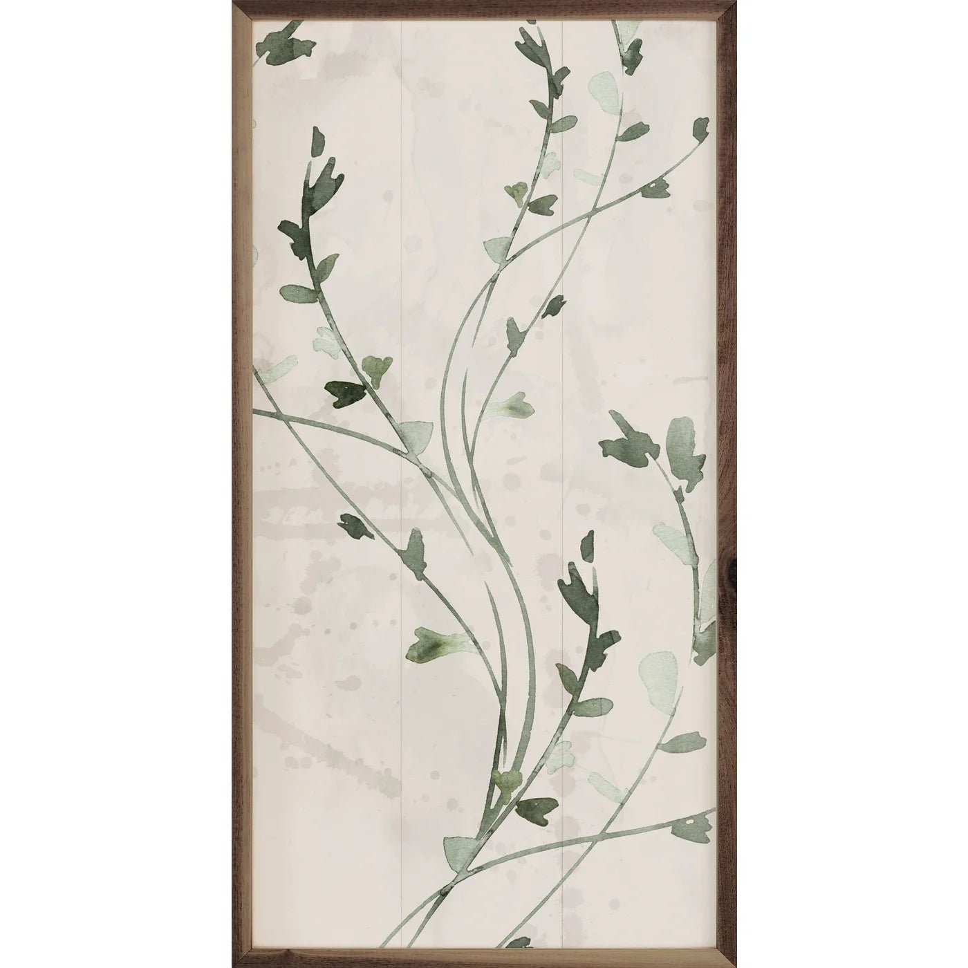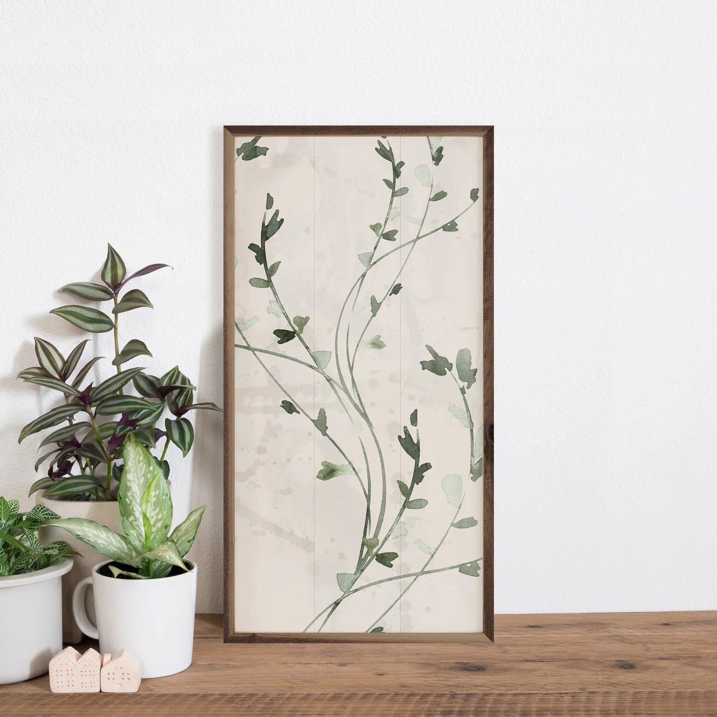 This simple yet beautiful vintage style wood print, featuring a walnut wood frame and a picture of green vines on a white shiplap background, is sure to provide beauty and farmhouse charm to any space.