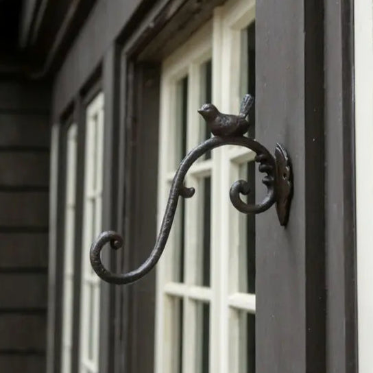 Add a vintage cottage feel to your outdoor space with our brown metal bird plant hooks, featuring a sweet perched bird and unique scroll hook design.