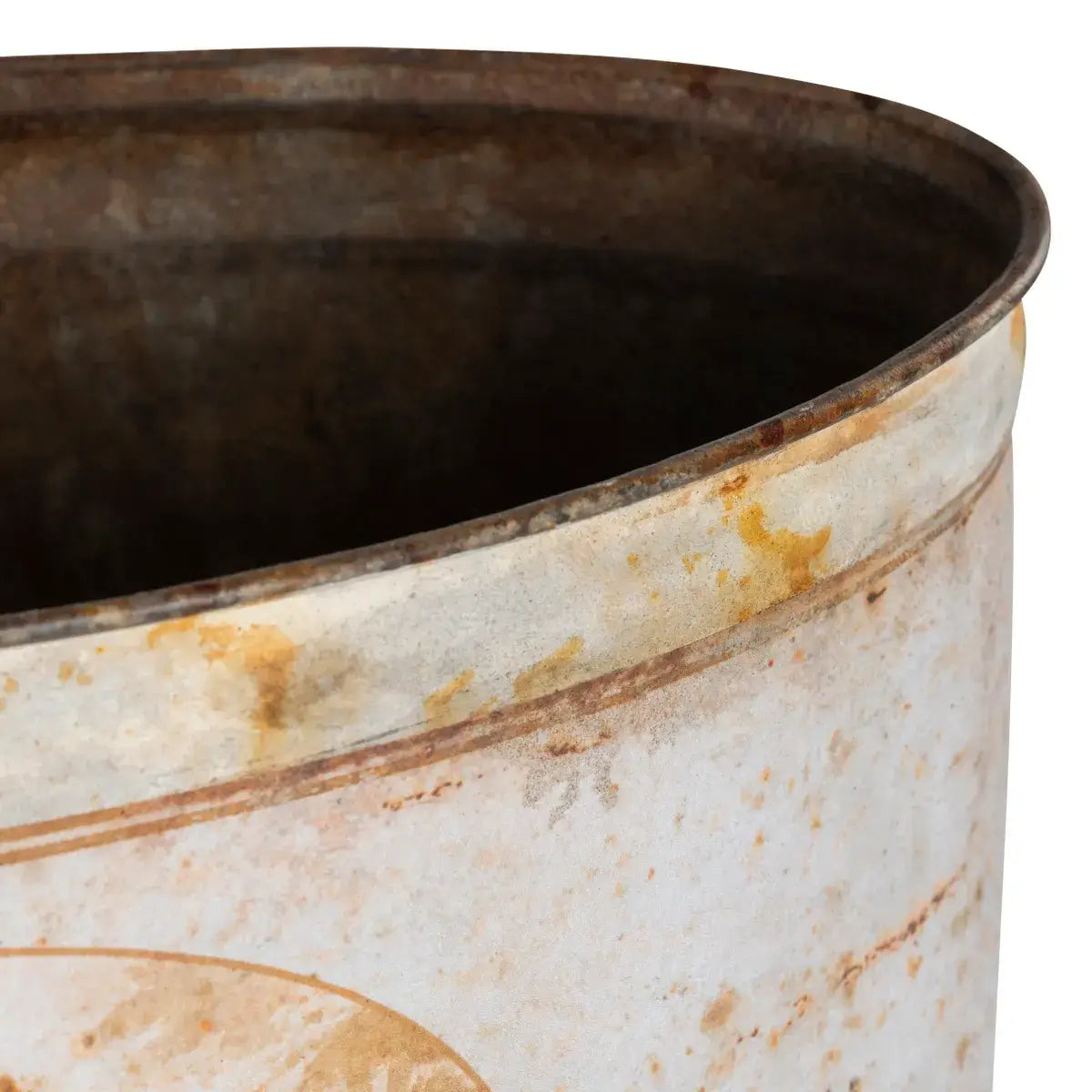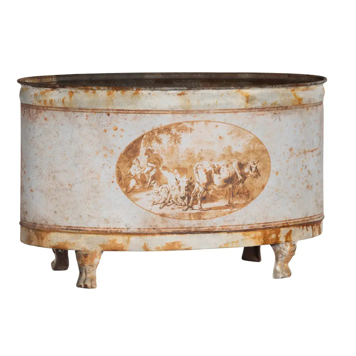 Our Burnished Pastoral Oval Tole Container features a beautifully aged cream and rust finish with an antique-style pastoral farm scene, set atop petite clawfoot legs, this piece is perfect for seasonal greenery or as a standalone accent, adding vintage French charm to any space.