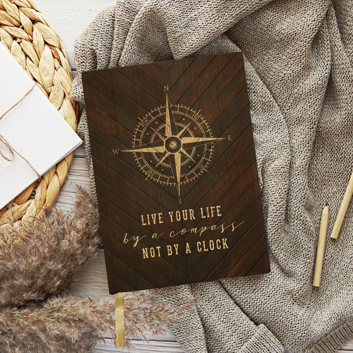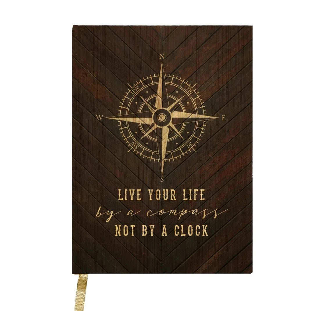 Elevate your writing and embrace your explorer era with our Compass Journal, featuring a gold compass over a wooden chevron print adorned with the inspirational phrase "Live Your Life By A Compass Not A Clock". This luxurious journal makes for a perfect gift, reminding loved ones to explore life to the fullest.