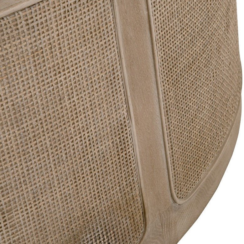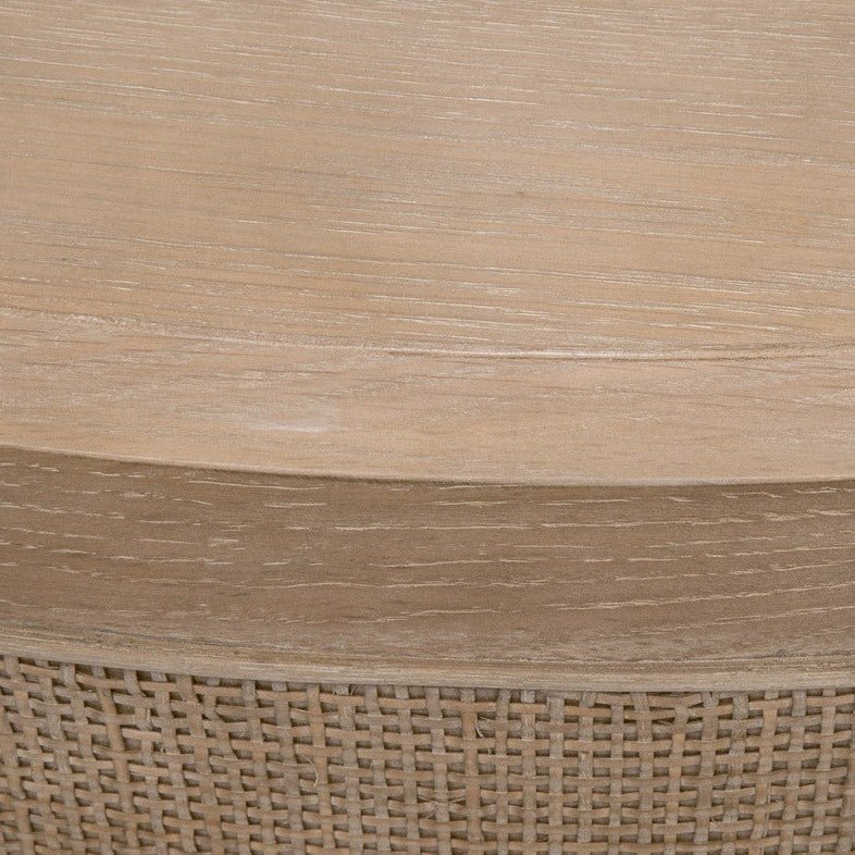 This beautiful large round coffee table, featuring solid oak wood with an oak veneer top and sides wrapped in gorgeous cane inlay with a wood border, is perfect for adding a unique touch with modern farmhouse charm to any space.